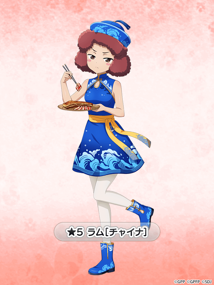 1girl blue_boots blue_dress blue_hat blush_stickers boots character_name chinese_clothes chopsticks closed_mouth commentary_request curly_hair dress food frown full_body girls_und_panzer girls_und_panzer_senshadou_daisakusen! glaring half-closed_eyes hat high_collar holding holding_chopsticks holding_plate legs_up looking_at_viewer meat official_alternate_costume official_art orange_background pantyhose plate print_boots print_dress print_headwear qingdai_guanmao red_background red_eyes red_hair rum_(girls_und_panzer) short_dress short_hair sleeveless sleeveless_dress solo standing standing_on_one_leg star_(symbol) tassel translated watermark wave_print white_pantyhose