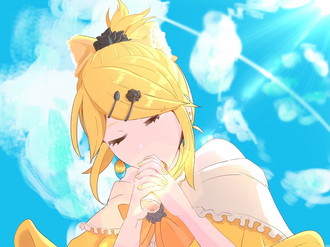 1girl akame_(akame0516) aku_no_musume_(vocaloid) anniversary bare_shoulders blonde_hair blue_sky bottle bow closed_eyes cloud diffraction_spikes dress dress_bow evillious_nendaiki from_below hair_bow hair_ornament hairclip high_ponytail holding holding_bottle interlocked_fingers kagamine_rin lens_flare message_in_a_bottle non-circular_lens_flare off-shoulder_dress off_shoulder orange_bow own_hands_clasped own_hands_together ponytail regret_message_(vocaloid) riliane_lucifen_d'autriche sidelocks sky solo swept_bangs updo vocaloid yellow_bow yellow_dress yellow_nails