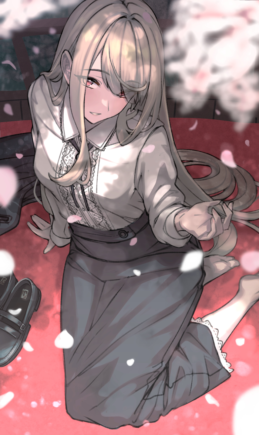 1girl barefoot black_shoes black_skirt blurry blurry_foreground breasts cherry_blossoms day grey_hair hair_over_one_eye highres long_hair long_sleeves looking_at_viewer medium_breasts mi2mi2_minmi original outdoors petals shirt shoes sitting skirt solo unworn_shoes white_shirt