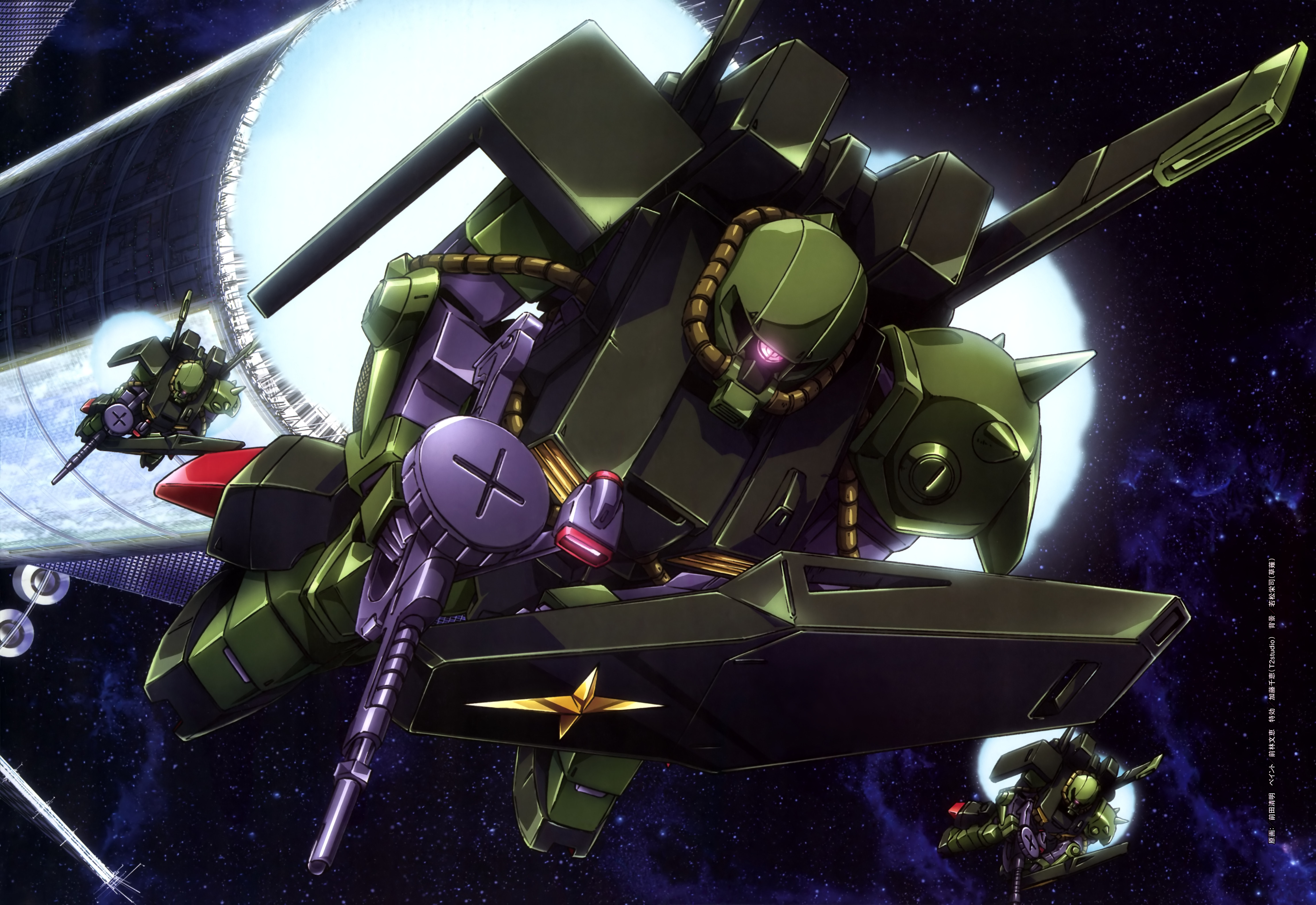 absurdres gun gundam gundam_perfect_file highres hizack maeda_seimei no_humans official_art shield space space_habitat weapon zeta_gundam
