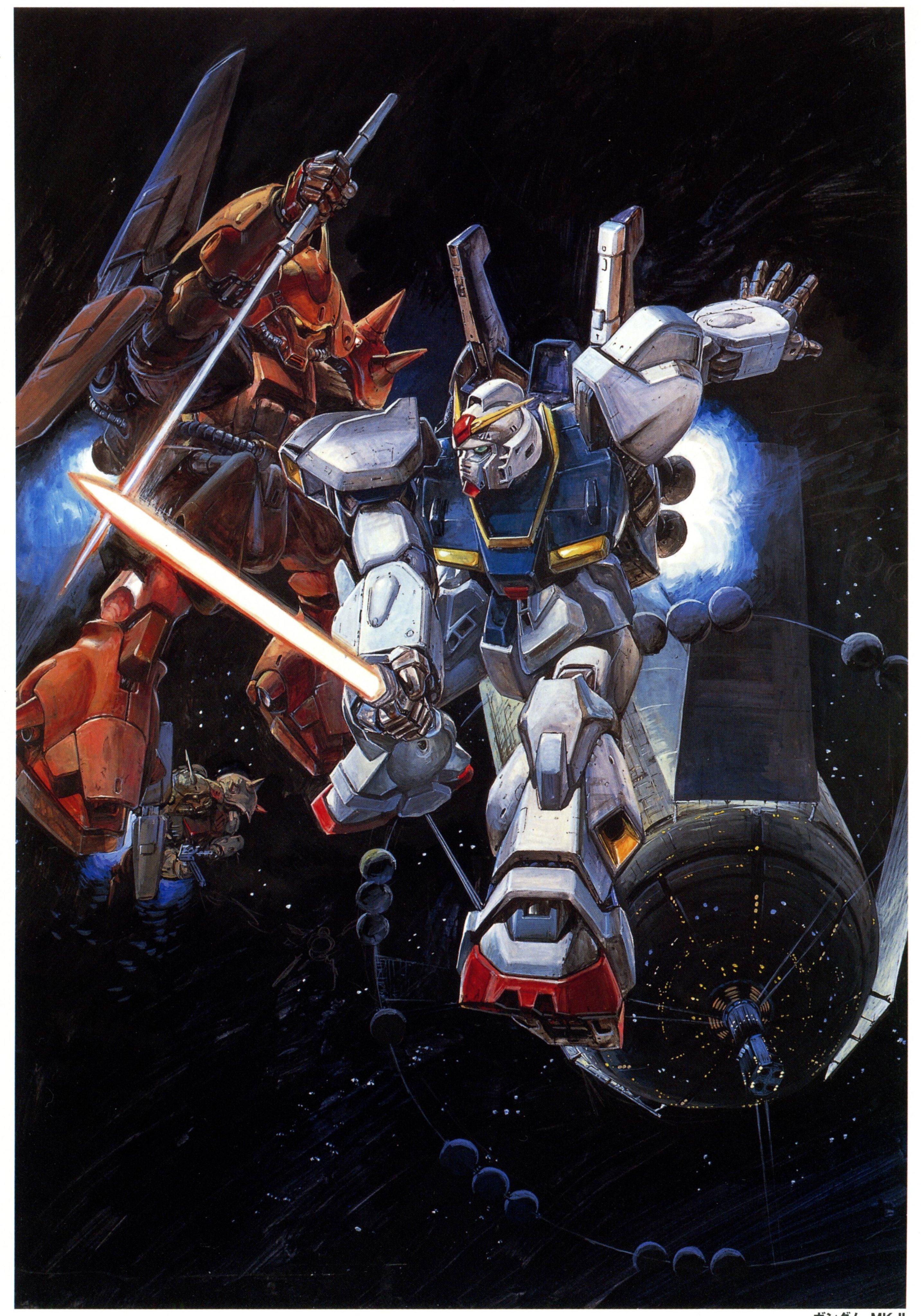 absurdres battle energy_sword gundam gundam_mk_ii highres marasai no_humans official_art space space_habitat spacecraft takani_yoshiyuki v-fin zeta_gundam