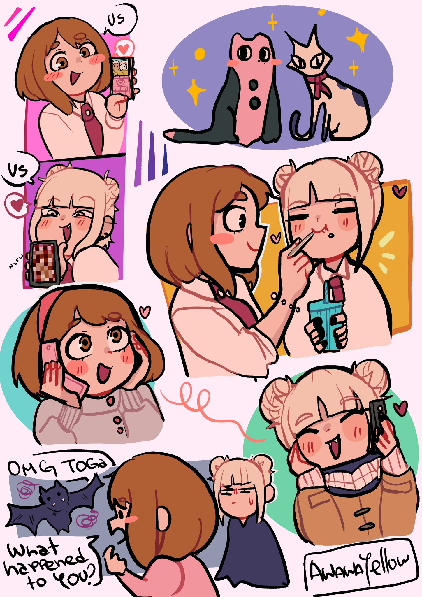 2girls ananayellow animal artist_name bat_(animal) black_nails blonde_hair blunt_bangs blush boku_no_hero_academia brown_eyes brown_hair cat closed_eyes closed_mouth collared_shirt commentary cup double_bun english_text feeding hair_bun hairband hand_on_own_face heart highres holding holding_cup holding_phone long_sleeves looking_at_another multiple_girls necktie open_mouth phone pink_background red_necktie school_uniform shirt short_hair simple_background smile spoken_heart toga_himiko u.a._school_uniform upper_body uraraka_ochako white_shirt yuri