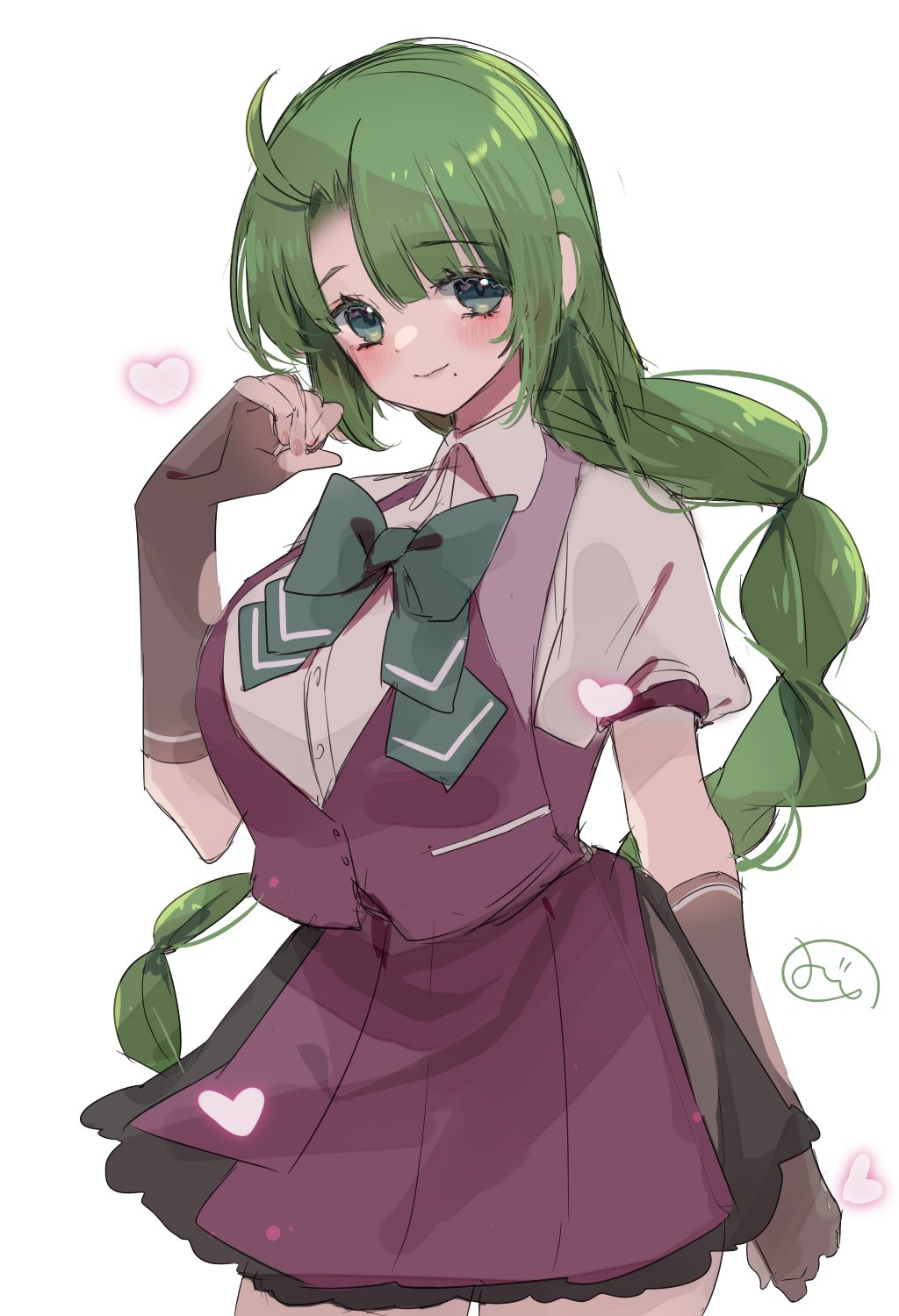 1girl aqua_bow aqua_bowtie blush bow bowtie braid brown_gloves closed_mouth collared_shirt cowboy_shot fingerless_gloves gloves green_eyes green_hair heart highres kantai_collection long_hair mizoredama1 mole mole_under_mouth purple_skirt purple_vest shirt short_sleeves simple_background single_braid skirt smile solo very_long_hair vest white_background white_shirt yuugumo_(kancolle) yuugumo_kai_ni_(kancolle)