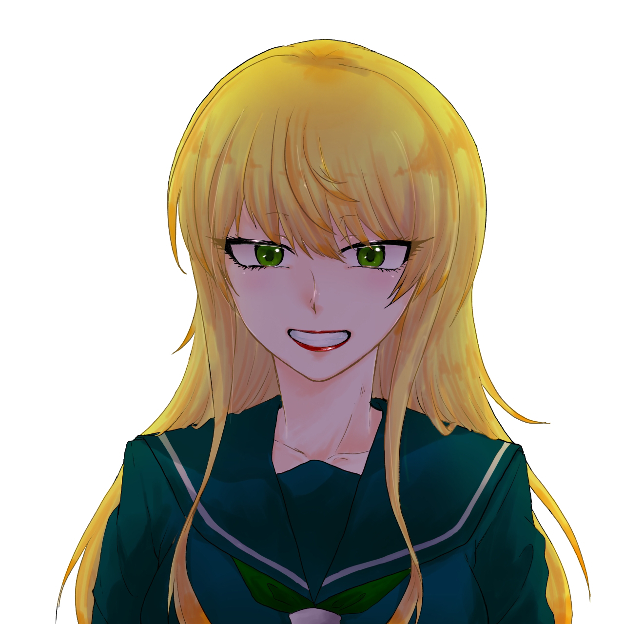 1girl blonde_hair blue_serafuku green_eyes green_neckerchief highres himawari_ranna long_hair looking_at_viewer neckerchief rokudou_no_onna-tachi school_uniform serafuku simple_background smile solo sonny_ban_(h_felo) white_background