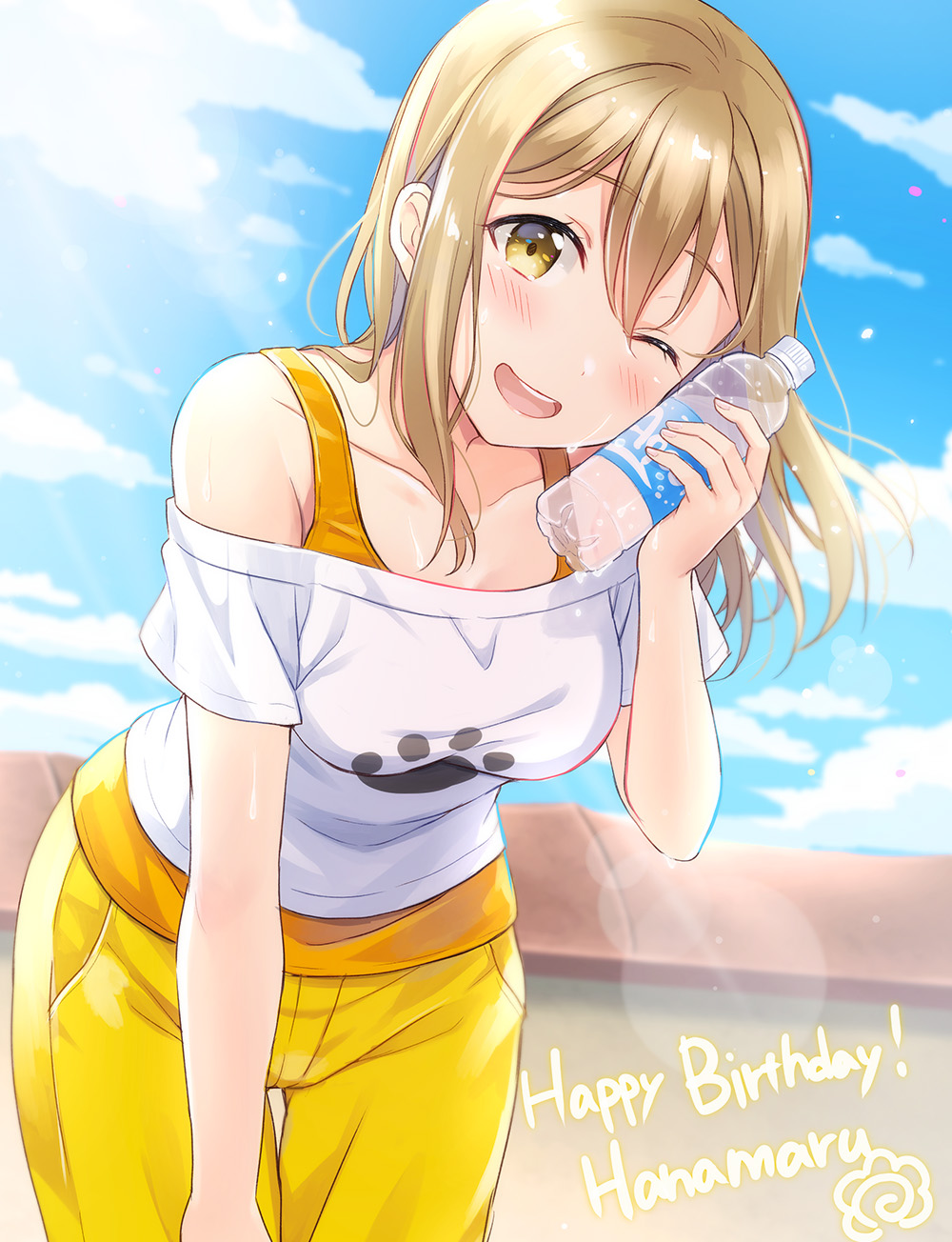 1girl ;d bottle brown_eyes brown_hair collarbone commentary day happy_birthday highres holding holding_bottle kunikida_hanamaru leaning_forward light_brown_hair long_hair looking_at_viewer love_live! love_live!_sunshine!! off-shoulder_shirt off_shoulder one_eye_closed open_mouth orange_tank_top outdoors pants sakou_mochi shirt smile solo sunlight tank_top water_bottle white_shirt yellow_pants