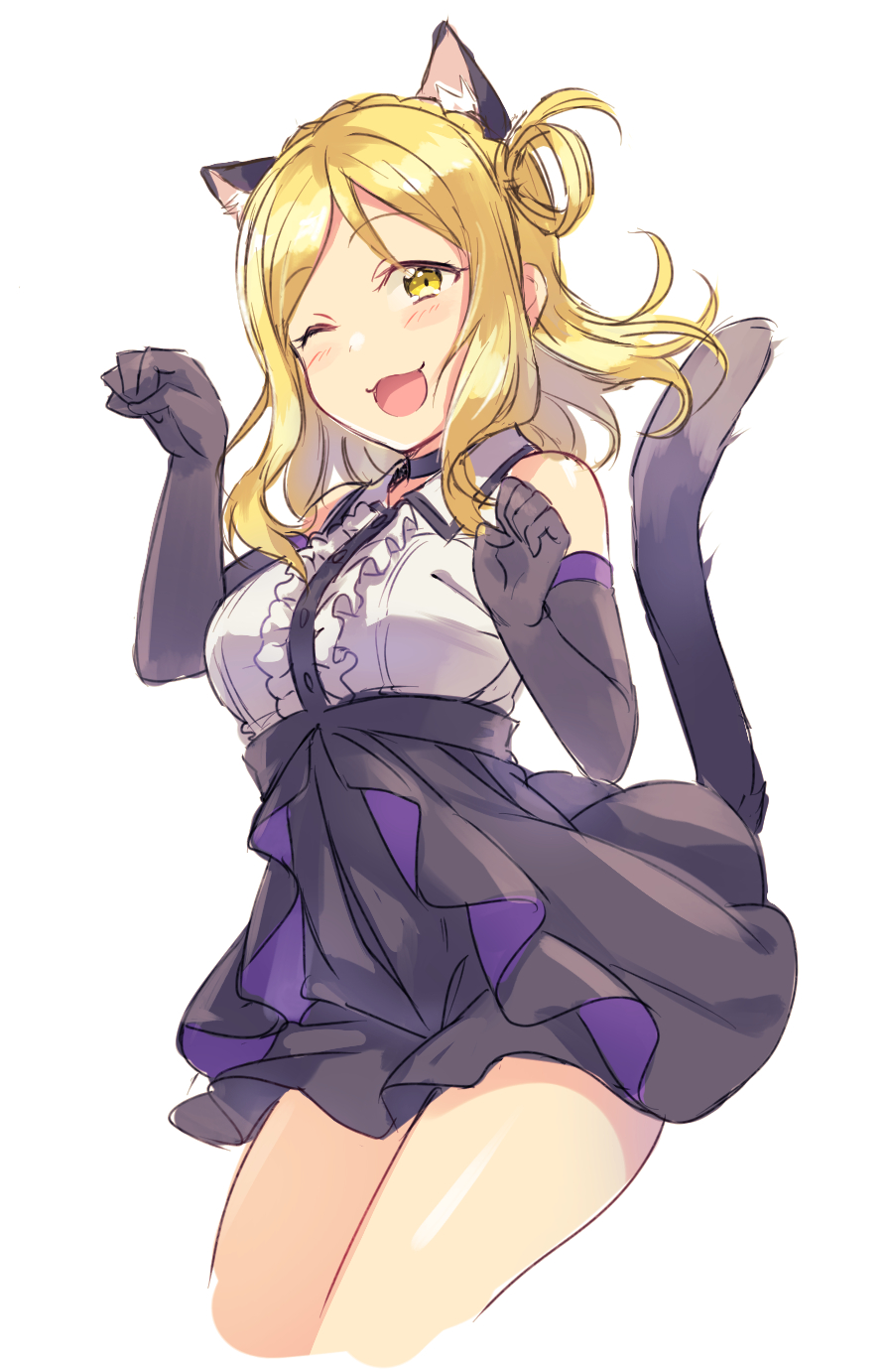 1girl :d ;3 animal_ears black_gloves black_skirt blonde_hair blouse braid breasts cat_ears cat_girl cat_tail commentary crown_braid curled_fingers elbow_gloves gloves hair_rings highres looking_at_viewer love_live! love_live!_sunshine!! medium_breasts medium_hair miniskirt ohara_mari one_eye_closed open_mouth paw_pose sakou_mochi shirt simple_background single_bang single_hair_ring sketch skirt sleeveless sleeveless_shirt smile solo tail white_background white_shirt