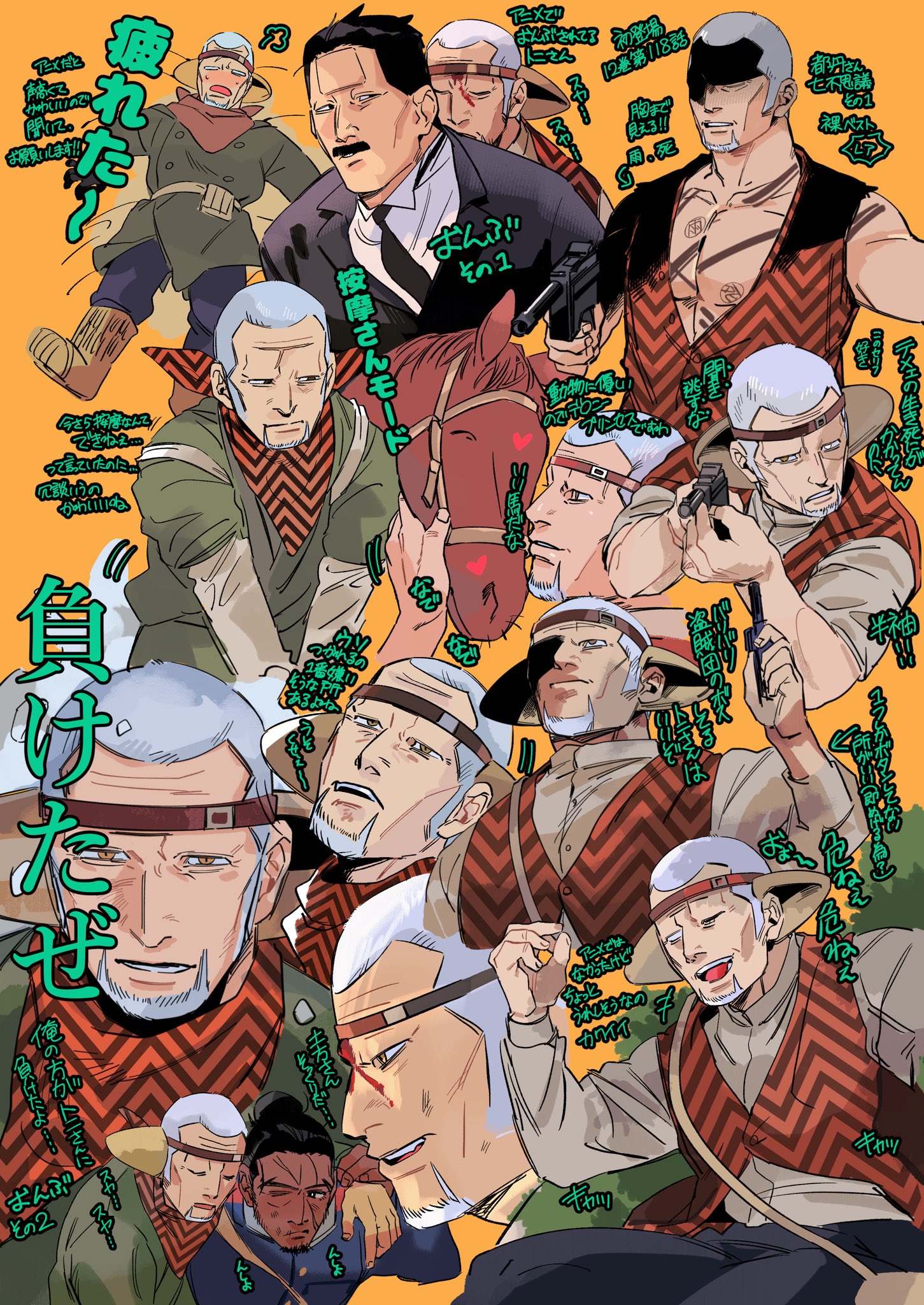 4boys beard black_hair blood blood_on_face brown_eyes brown_footwear buzz_cut clenched_hand coat facial_hair golden_kamuy green_(grimy) grey_hair gun highres holding holding_gun holding_weapon horse japanese_clothes kimono multiple_boys multiple_views necktie old old_man orange_background rikimatsu_ariko running shiraishi_yoshitake short_hair tasuki tattoo toni_anji ushiyama_tatsuma very_short_hair vest weapon