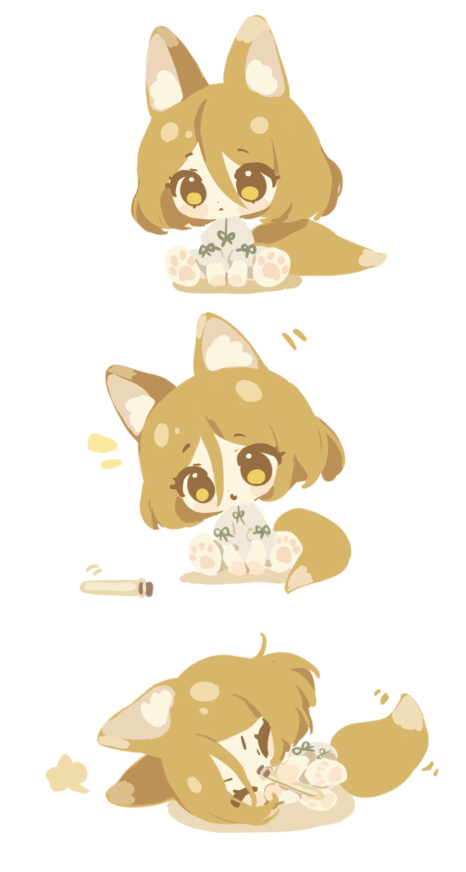 1girl 3koma puff_of_air absurdres animal_ears blush chibi comic fox_ears fox_tail full_body hair_between_eyes highres kudamaki_tsukasa light_brown_hair lying notice_lines on_side pawpads short_hair simple_background sitting springarashi02 tail test_tube touhou yellow_eyes