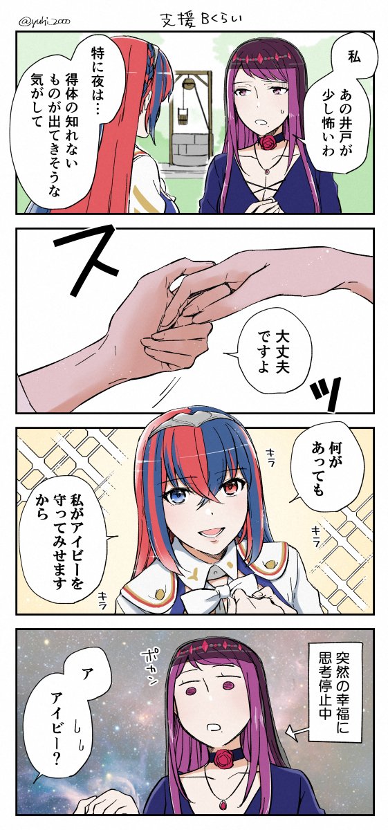 2girls female_alear_(fire_emblem) blue_eyes blue_hair braid breasts cleavage crossed_bangs dress female_focus fire_emblem fire_emblem_engage heterochromia highres holding_hands ivy_(fire_emblem) japanese_text long_hair looking_at_viewer matching_hair/eyes medium_breasts mole mole_under_mouth multicolored_hair multiple_girls nintendo open_mouth purple_eyes purple_hair red_eyes red_hair smile speech_bubble split-color_hair sweatdrop tiara two-tone_hair very_long_hair yuri yuuhi_(arcadia)
