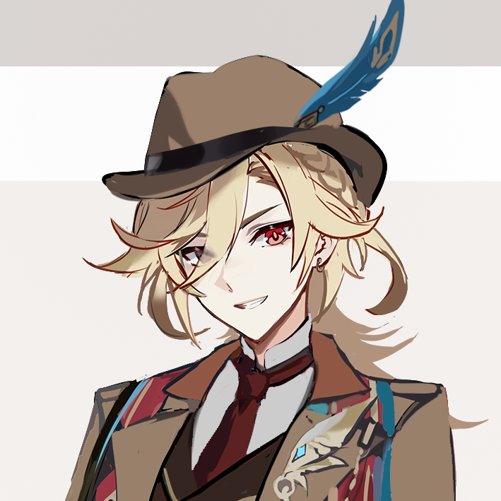 0jae 1boy black_vest blonde_hair braid brown_hair brown_hat brown_jacket earrings fedora genshin_impact grey_background hat hat_feather jacket jewelry kaveh_(genshin_impact) male_focus medium_hair multicolored_background multicolored_hair necktie red_eyes red_necktie shirt sketch smile solo teeth vest white_background white_shirt