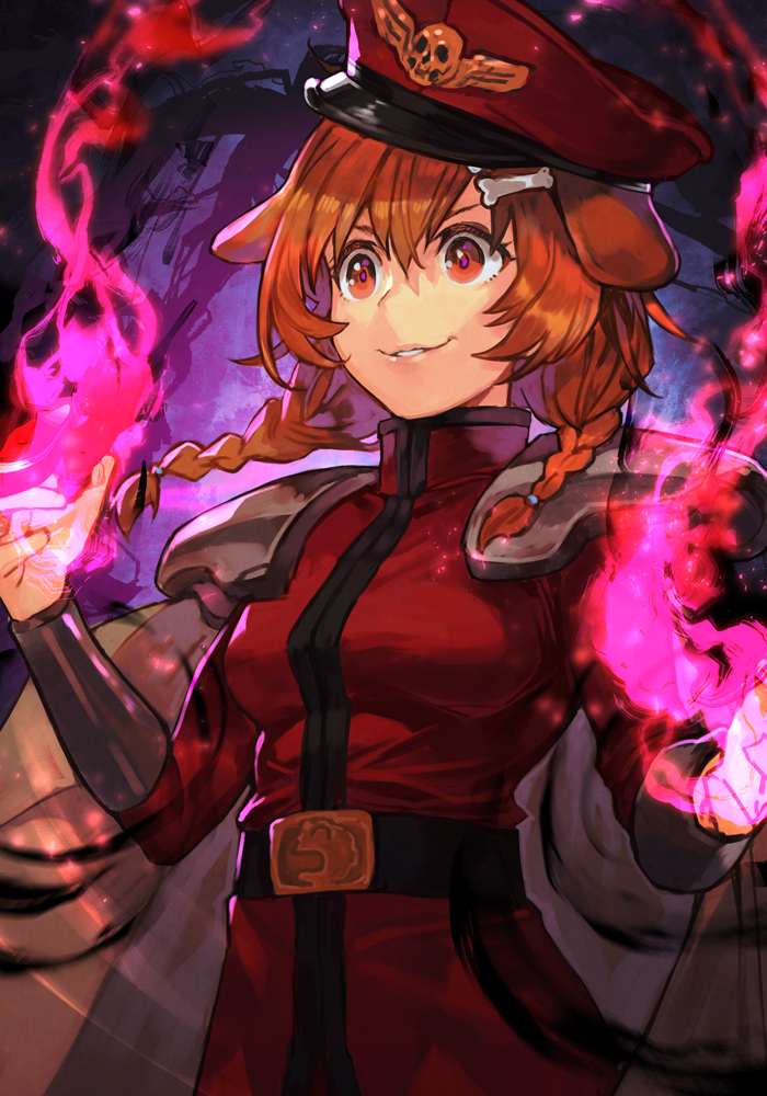 1girl animal_ears bone_hair_ornament braid breasts brown_eyes brown_hair cape cosplay dog_ears evil_grin evil_smile glowing_hands grin hair_ornament hat hat_ornament hololive hungry_clicker inugami_korone long_hair low_twin_braids m._bison m_bison_(cosplay) medium_breasts military military_uniform parted_lips red_hat shoulder_pads skull skull_hat_ornament smile solo street_fighter teeth twin_braids upper_body virtual_youtuber