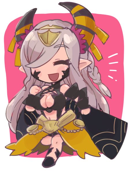 1girl breasts chibi cleavage closed_eyes fire_emblem fire_emblem_engage grey_hair happy horns jewelry large_breasts long_hair monster_girl nintendo pointy_ears solo tagme tamatamariso85 zelestia_(fire_emblem)
