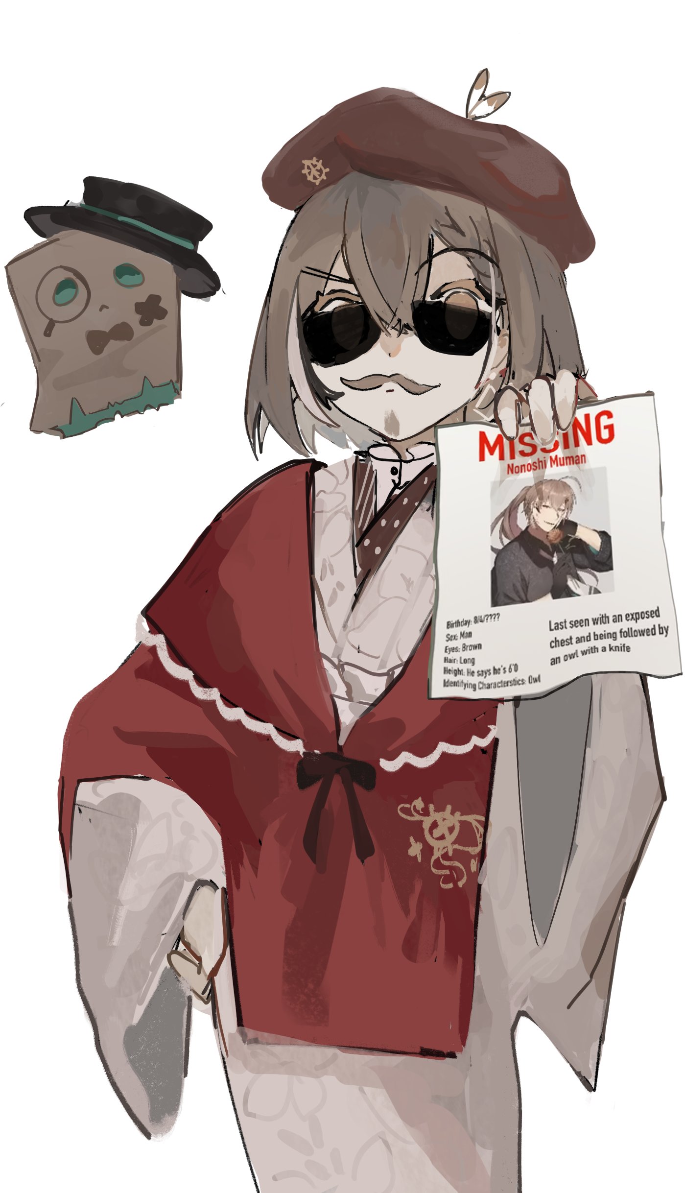 1girl absurdres ahoge beret bow bowtie braid braided_bangs brown_eyes brown_hair eimmii facial_hair fake_facial_hair fake_mustache feathers floral_print friend_(nanashi_mumei) gloves goatee hand_on_own_hip hat highres hololive hololive_english japanese_clothes kimono lace lace_gloves missing_poster multicolored_hair nanashi_muman nanashi_mumei nanashi_mumei_(new_year) official_alternate_costume print_kimono red_shawl ribbon shawl short_hair sketch streaked_hair top_hat virtual_youtuber white_kimono wide_sleeves
