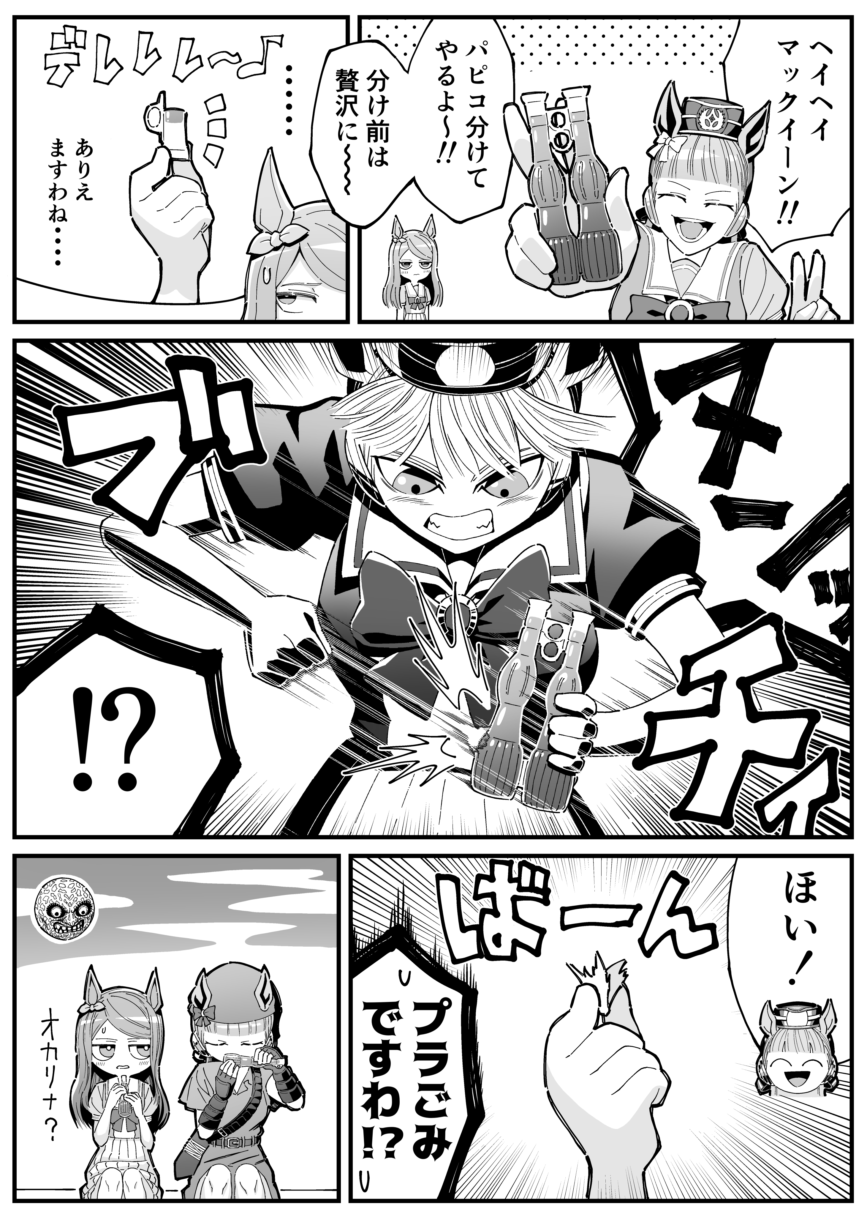 !? 2girls ^_^ absurdres blunt_bangs bow clenched_teeth closed_eyes comic cosplay ear_ornament ears_through_headwear emphasis_lines facing_viewer fingerless_gloves food gloves gold_ship_(umamusume) greyscale hat highres link link_(cosplay) looking_at_another looking_at_object mejiro_mcqueen_(umamusume) monochrome moon_(zelda) multiple_girls nintendo orenamonaki papico_(ice_cream) parody sailor_collar school_uniform shirt sitting skirt smile strong teeth the_legend_of_zelda the_legend_of_zelda:_majora's_mask translation_request tunic umamusume