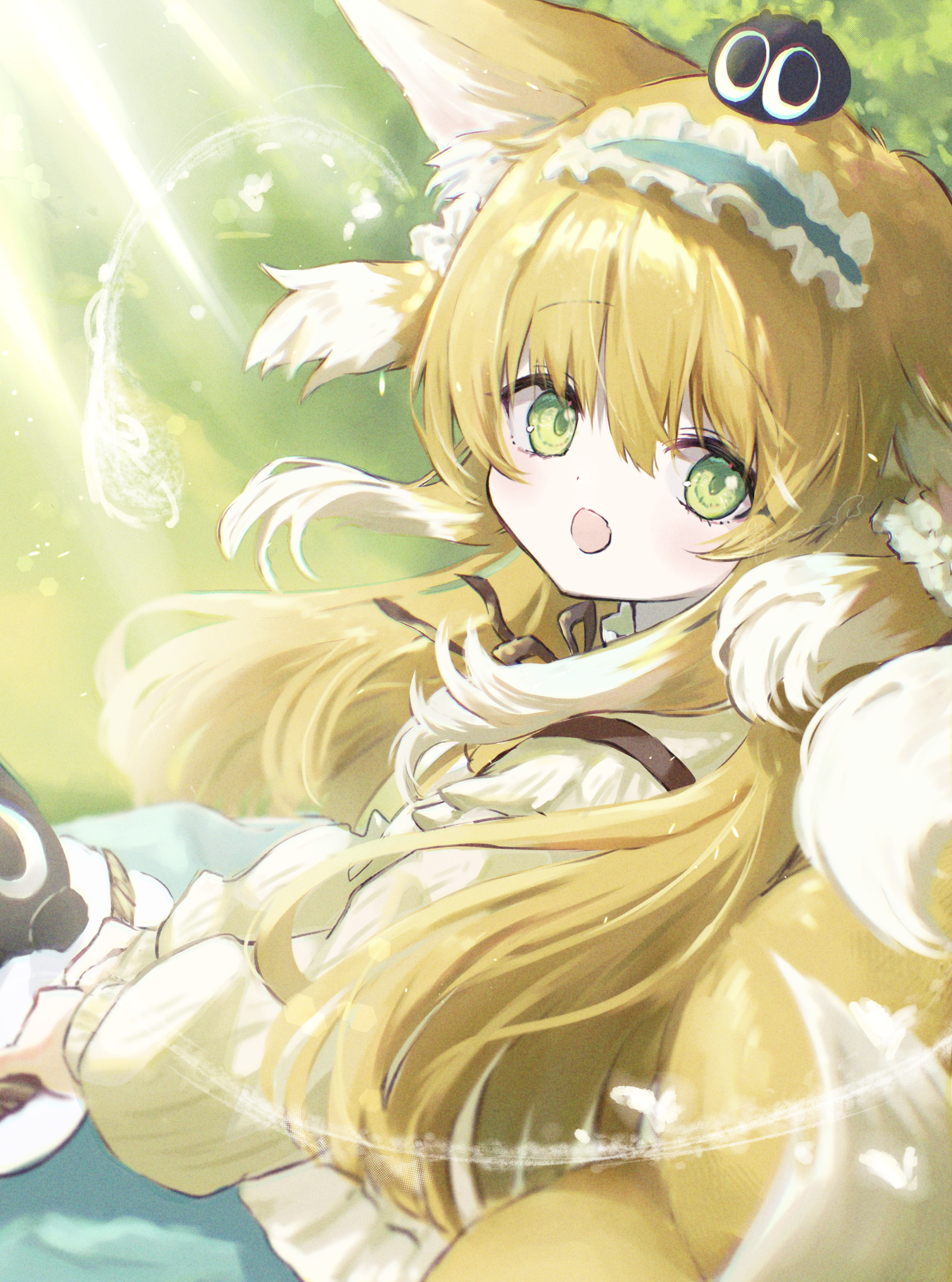 1girl animal_ear_fluff animal_ears arknights basket black_cat blonde_hair blue_hairband blue_skirt cardigan cat commentary crossover fox_ears fox_girl fox_tail frilled_hairband frills from_side green_eyes hair_ornament hair_scrunchie hairband heixiu highres holding holding_basket kitsune kyuubi long_hair long_sleeves looking_at_viewer luo_xiaohei multicolored_hair multiple_tails official_alternate_costume on_head open_mouth puffy_long_sleeves puffy_sleeves red_ribbon ribbon scrunchie skirt sleeve_cuffs slime_empire solo suzuran_(arknights) suzuran_(spring_praise)_(arknights) tail luo_xiaohei_zhanji two-tone_hair white_hair yellow_cardigan