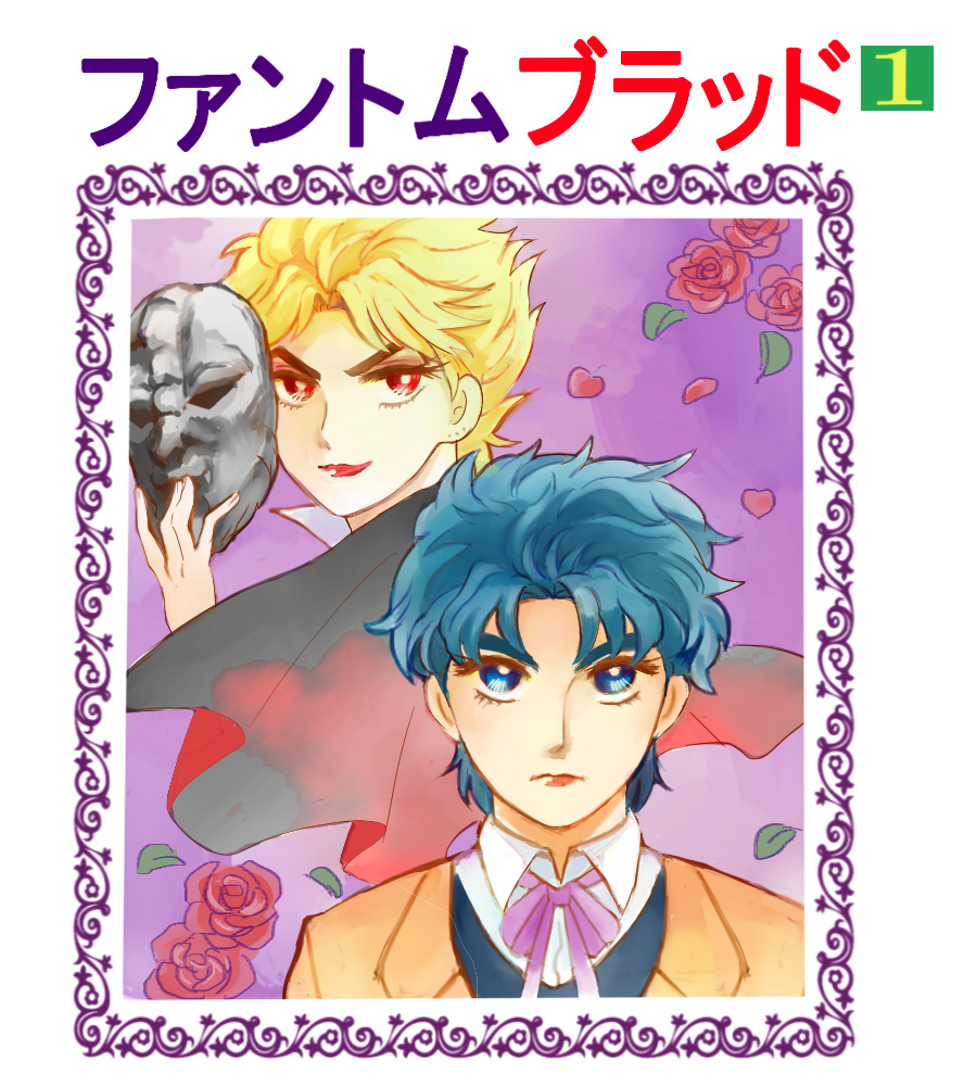 2boys blonde_hair blue_eyes blue_hair bow cape cover dio_brando fake_cover flower holding holding_mask jojo_no_kimyou_na_bouken jonathan_joestar kirikabu-yume male_focus mask multiple_boys parody phantom_blood red_eyes rose stone_mask_(jojo) style_parody