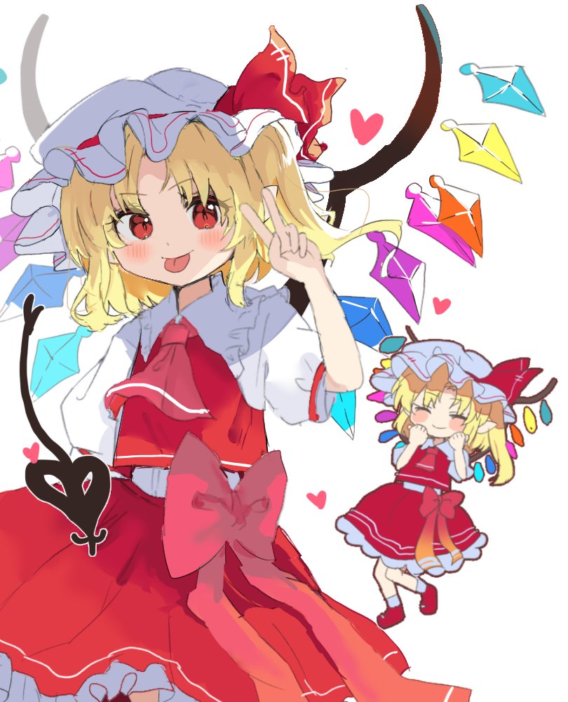 1girl :p ascot blonde_hair blush blush_stickers bow crystal flandre_scarlet flat_chest full_body hand_up hat heart laevatein_(touhou) medium_hair mob_cap multiple_views one_side_up puffy_sleeves ramochi red_bow red_eyes red_skirt red_vest short_sleeves simple_background skirt smile tongue tongue_out touhou v vest white_background white_headwear wings