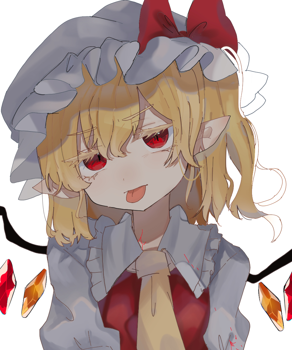 1girl ascot blonde_hair blood blood_on_clothes crystal eyelashes flandre_scarlet half-closed_eyes hat head_tilt highres medium_hair mob_cap one_side_up pointy_ears ramochi red_eyes red_vest short_sleeves simple_background solo tongue tongue_out touhou upper_body vest white_background white_hat wings