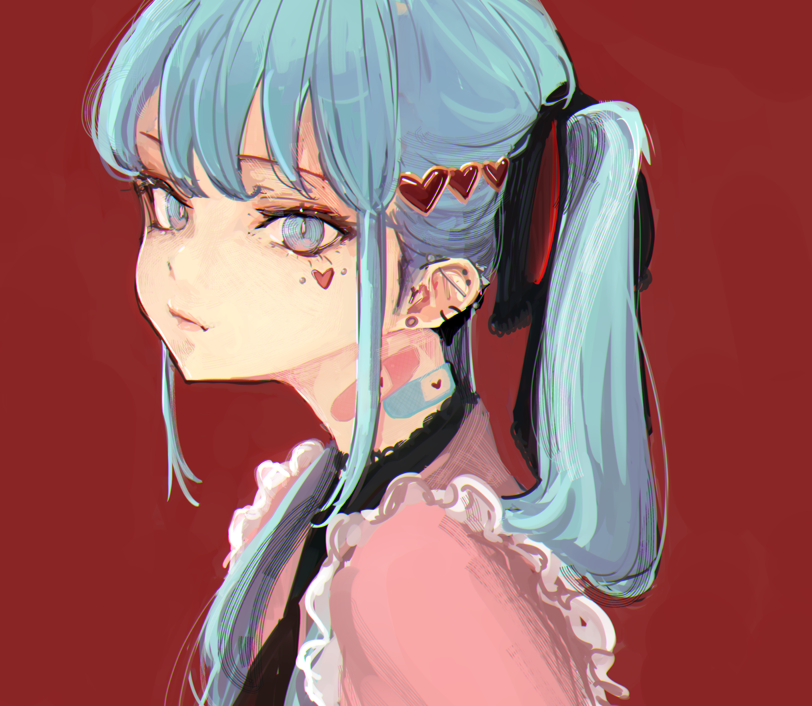 1girl aqua_eyes aqua_hair bandaid bandaid_on_neck closed_mouth ear_piercing earrings facial_mark from_side hair_ornament hatsune_miku heart heart_facial_mark heart_hair_ornament higemu highres jewelry long_hair looking_at_viewer piercing pink_shirt red_background shirt solo twintails upper_body vampire_(vocaloid) vocaloid
