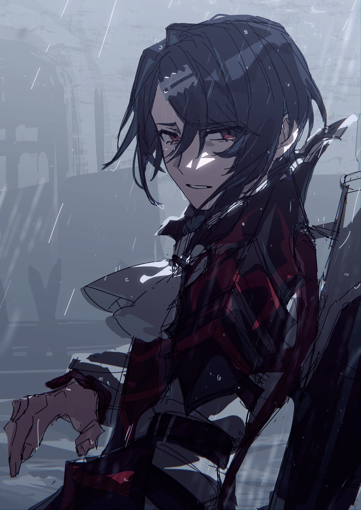 1boy alcryst_(fire_emblem) armor ascot bad_id bad_poipiku_id blue_hair fire_emblem fire_emblem_engage hair_between_eyes hair_ornament hairclip high_collar highres looking_at_viewer muted_color nintendo rain red_eyes short_hair solo upper_body white_ascot yama_ym0000