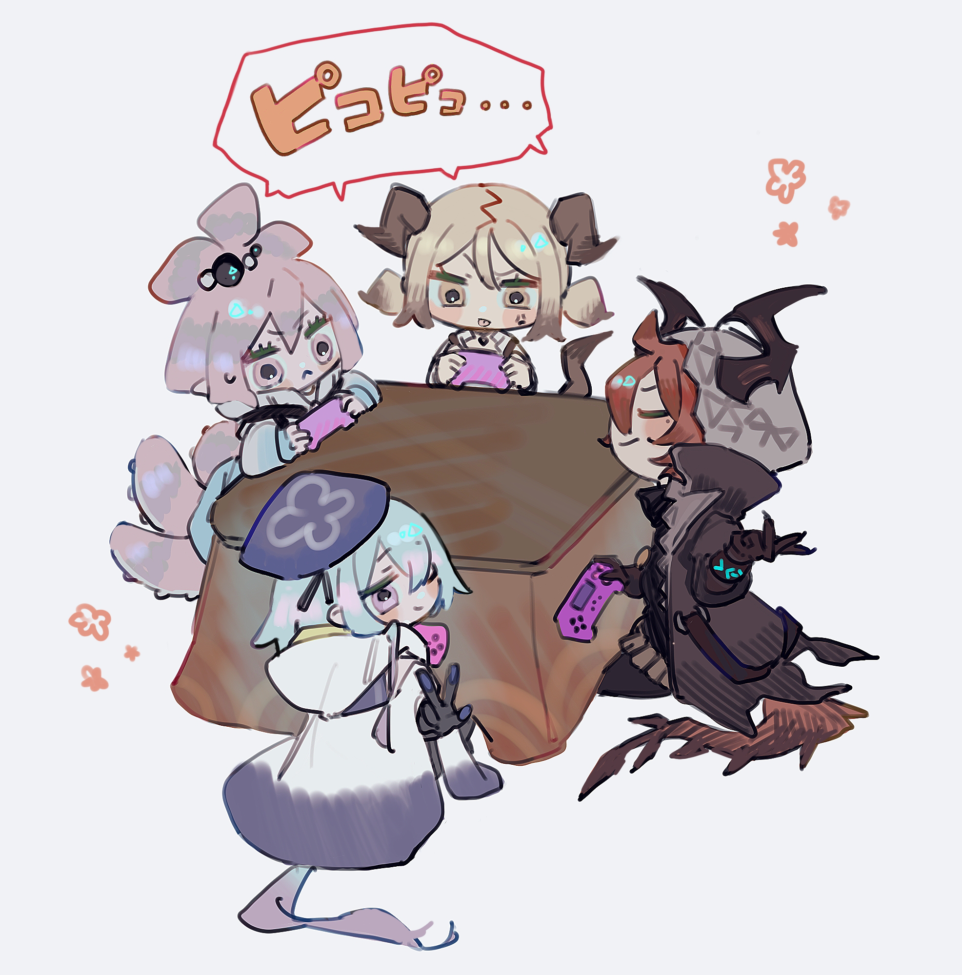 2boys 2girls arknights highres horns ifrit_(arknights) kirara_(arknights) kotatsu mi_(mituki_wandoro) mizuki_(arknights) multiple_boys multiple_girls multiple_tails sesa_(arknights) simple_background table tail tentacles translation_request white_background