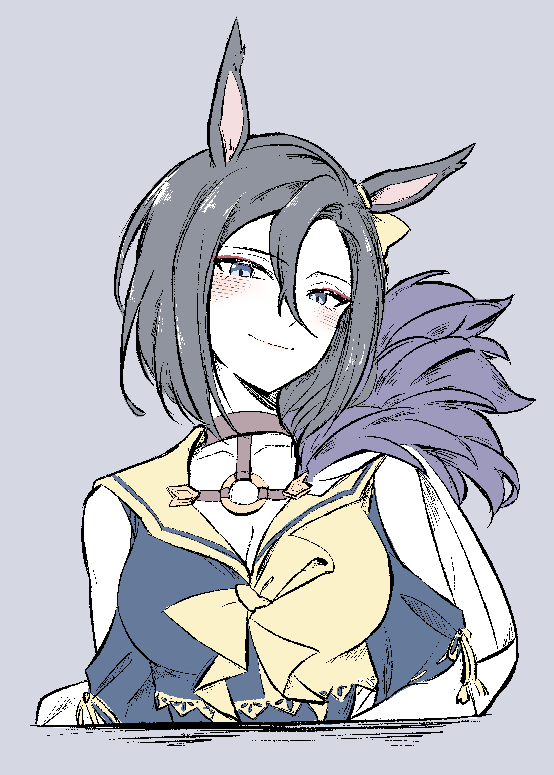 1girl air_groove_(umamusume) animal_ears blue_eyes blush bow choppy_bangs commentary cropped_torso ear_bow grey_background hair_between_eyes half-closed_eyes highres horse_ears horse_girl looking_at_viewer medium_hair purple_eyes simple_background smile solo untranslatable_commentary taisaaa umamusume upper_body yellow_bow