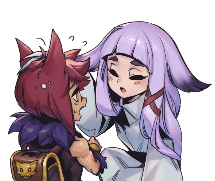 1boy 1girl animal_ears backpack bag blush character_request flying_sweatdrops fur_collar grey_hair grey_kimono japanese_clothes kimono league_of_legends long_hair long_sleeves mother_and_child mother_and_son open_mouth orange_eyes parent_and_child phantom_cross red_hair sett's_mother_(league_of_legends) sett_(league_of_legends) sharp_teeth shiny_skin simple_background teeth upper_teeth_only white_background wide_sleeves