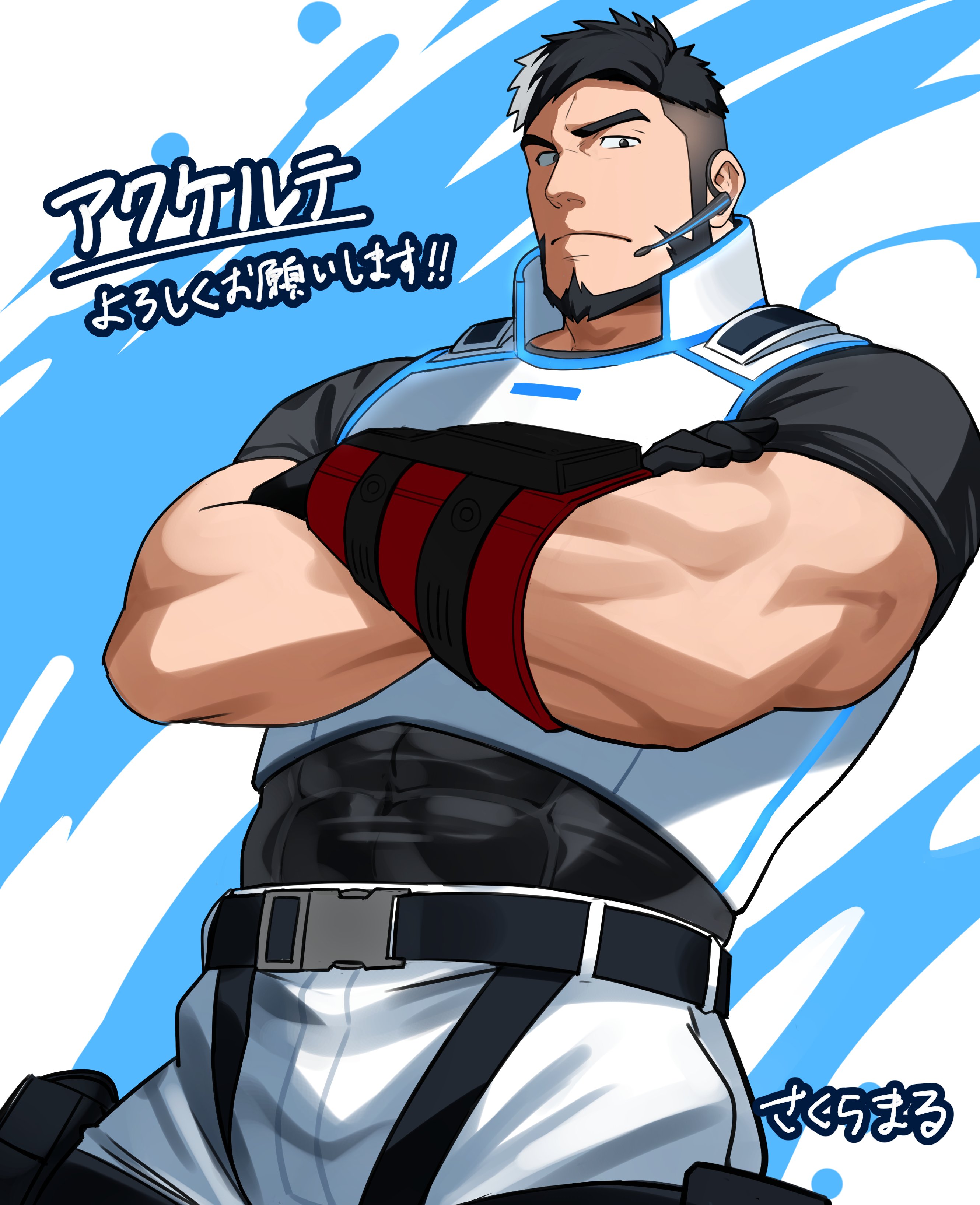 1boy absurdres bara beard belt character_request covered_abs crave_saga crossed_arms facial_hair from_below highres looking_at_viewer male_focus multicolored_hair muscular muscular_male sakuramarusan shirt short_hair single_sleeve solo taut_clothes taut_shirt thick_eyebrows translation_request two-tone_hair undercut white_hair