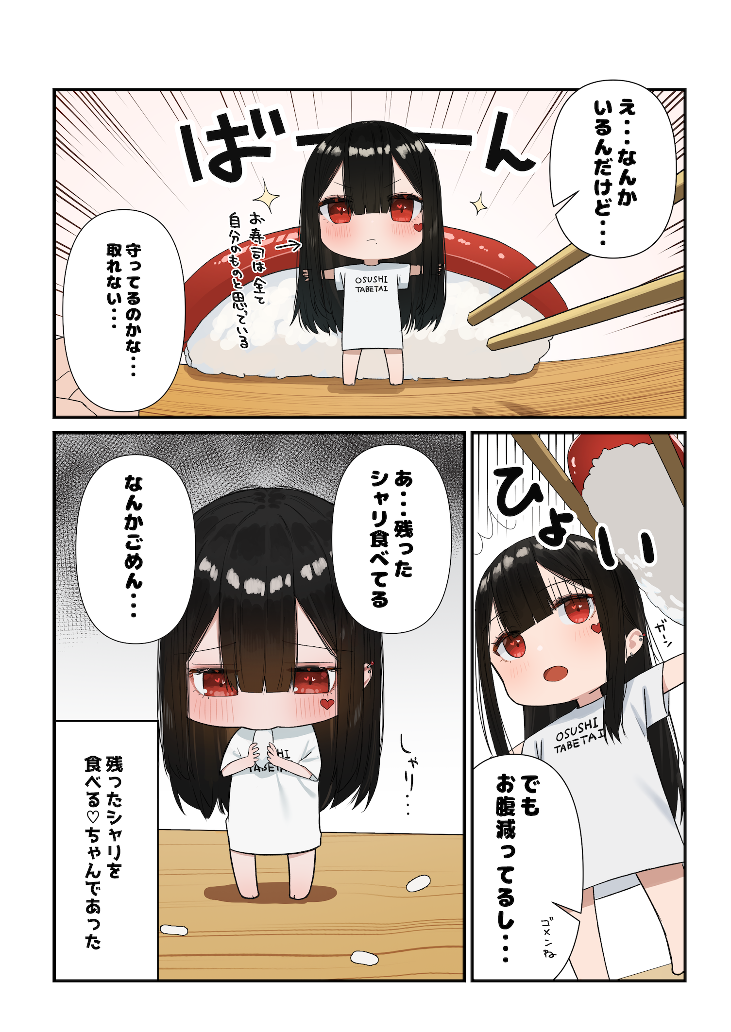 1girl 3koma black_hair blunt_bangs chibi chopsticks comic commentary_request ear_piercing earrings eating emphasis_lines enokawa_kokoro_(hara_kenshi) facial_mark fish_(food) food hara_kenshi heart heart-shaped_pupils highres holding holding_food jewelry long_hair mini_person minigirl nigirizushi open_mouth original piercing red_eyes rice serious shirt sound_effects speech_bubble standing sushi symbol-shaped_pupils t-pose t-shirt translation_request white_shirt