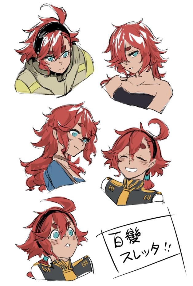 1girl ahoge ani_lu asticassia_school_uniform black_hairband blue_eyes gundam gundam_suisei_no_majo hair_between_eyes hairband jacket long_hair low_ponytail multiple_views official_alternate_costume ponytail red_hair school_uniform smile suletta_mercury thick_eyebrows