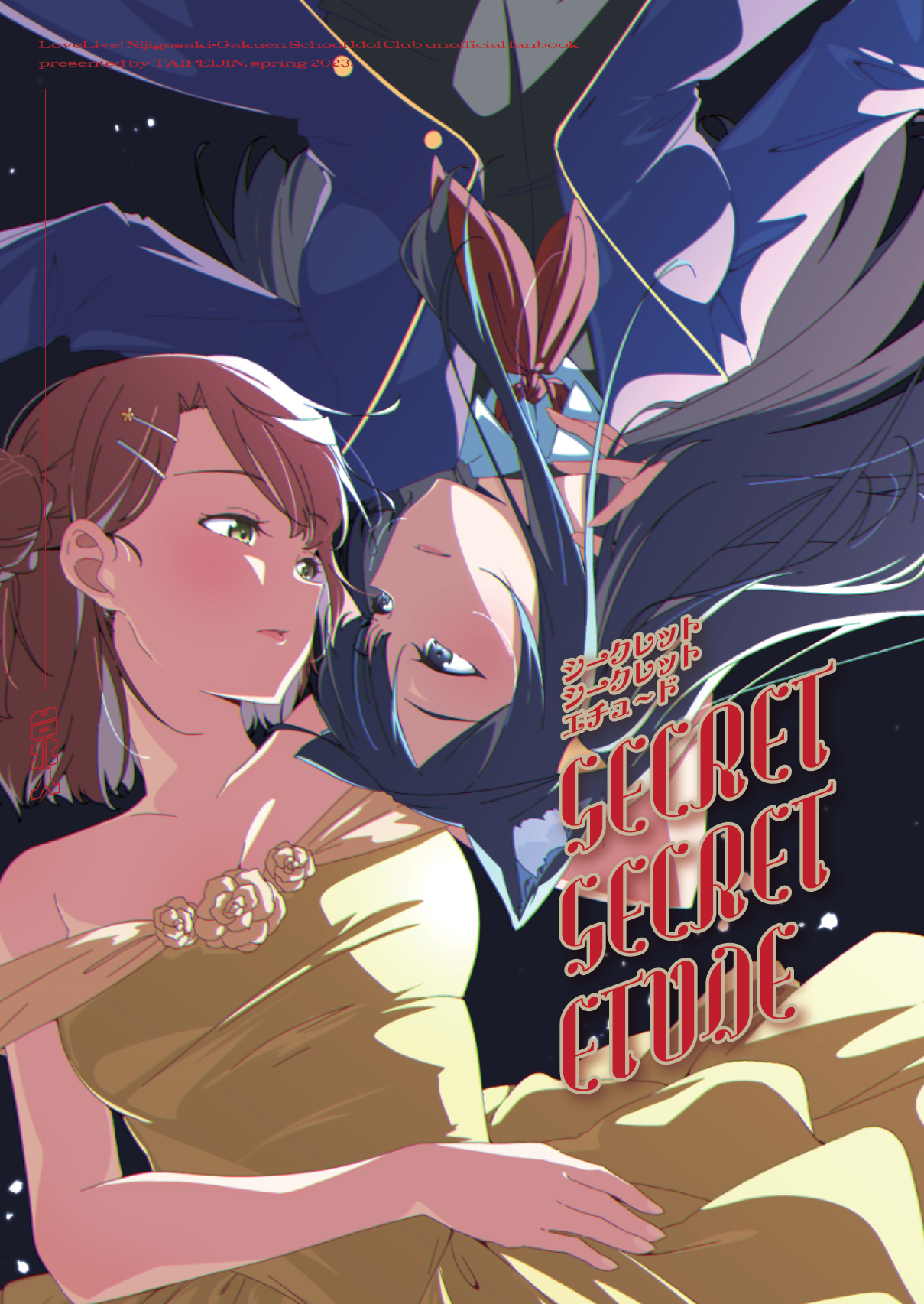 2girls animal_ears bare_shoulders black_background blue_suit blush bow braid braided_bun breasts bun_with_braided_base chromatic_aberration close-up closed_mouth collarbone commentary cover dress dress_flower eye_contact fingernails flower formal_clothes grey_eyes hair_between_eyes hair_bun hair_ornament hairclip half-closed_eyes hand_in_another's_hair handkerchief highres kemonomimi_mode large_breasts lips long_hair looking_at_another love_live! love_live!_nijigasaki_high_school_idol_club medium_breasts medium_hair multiple_girls musihara off-shoulder_dress off_shoulder one_side_up orange_hair parallel_hairclips parted_lips single_side_bun suit uehara_ayumu upside-down yellow_dress yellow_eyes yuki_setsuna yuri
