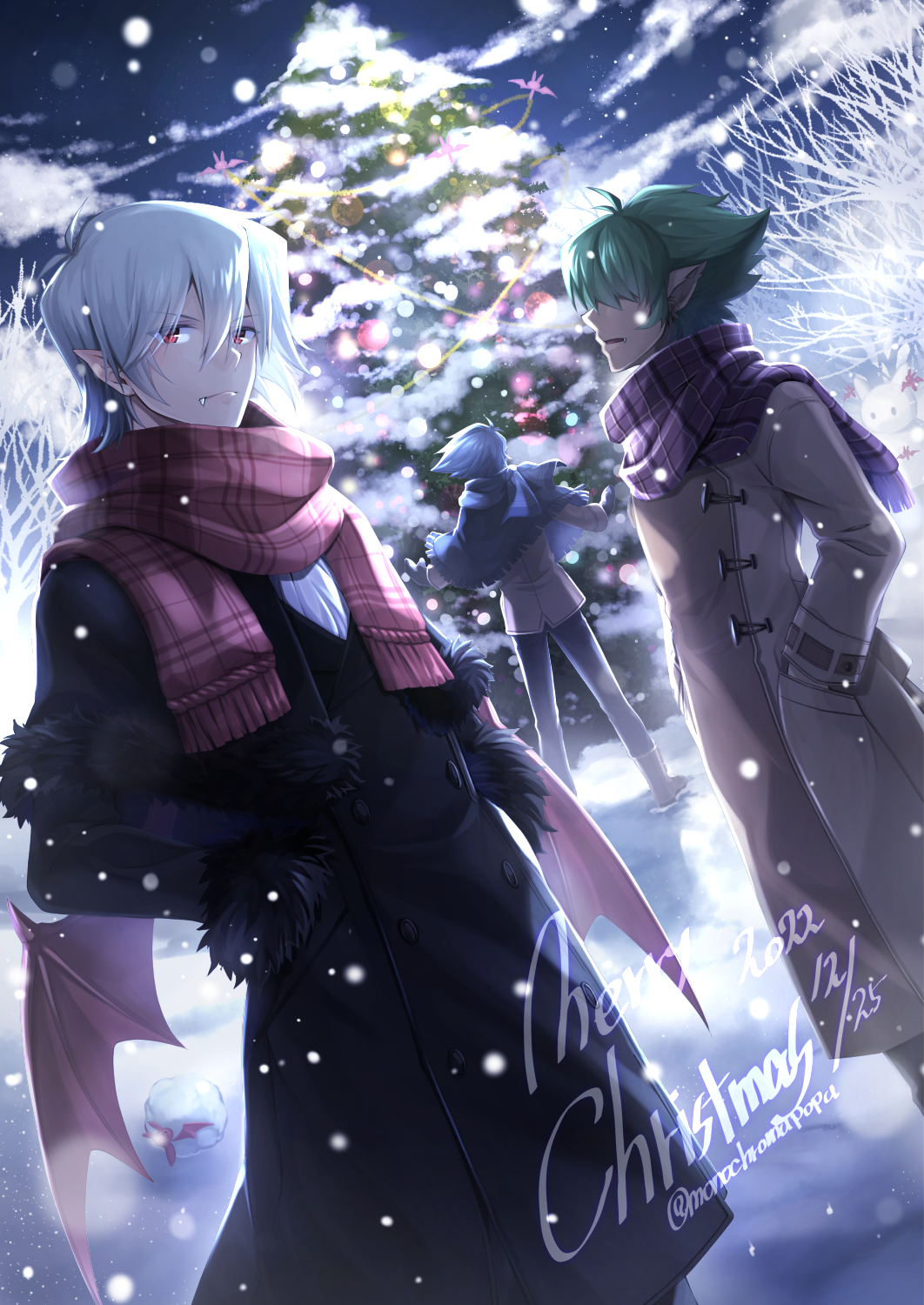 3boys ash_(pop'n_music) bare_tree bat_(animal) bemani brown_coat christmas_tree coat fang fur-trimmed_coat fur_trim green_hair hair_over_eyes hand_in_pocket highres male_focus merry_christmas monochromupopu monster_boy multiple_boys open_mouth pointy_ears pop'n_music red_eyes red_scarf scarf shawl short_hair smile_(pop'n_music) snow snowball tree vampire werewolf white_hair winter winter_clothes yuli_(pop'n_music)