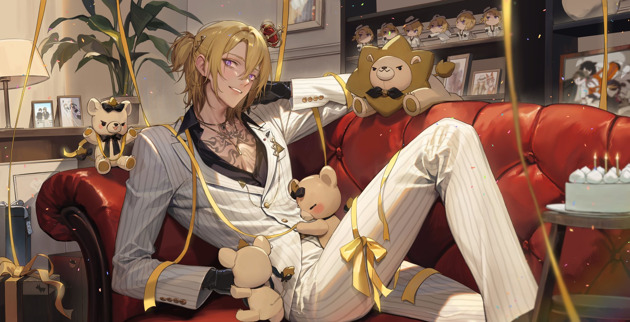 1boy :3 arm_up augustus_(luca_kaneshiro) birthday birthday_cake black_gloves black_shirt blonde_hair blush box breast_pocket buttoned_cuffs buttons cake candle chest_tattoo choker closed_eyes closed_mouth collared_shirt commentary couch crown desk_lamp english_commentary fire food formal_clothes gift gift_box gloves hair_between_eyes hair_ornament hairclip handkerchief highres hug ike_eveland indoors jacket jewelry knee_up lamp lapels long_sleeves looking_at_viewer luca_kaneshiro luca_kaneshiro_(1st_costume) lucub_(luca_kaneshiro) male_focus medium_hair mini_crown mysta_rias necklace nijisanji nijisanji_en on_couch open_clothes open_collar pants papa_(you_have_today) parted_bangs parted_lips pectorals photo_(object) picture_frame pinstripe_pattern pinstripe_suit plant pocket potted_plant purple_eyes ribbon shelf shirt short_side_ponytail shu_yamino side_ponytail sidelocks sitting smile streamers striped_clothes striped_jacket striped_pants suit table tattoo teeth tilted_headwear v-shaped_eyebrows virtual_youtuber vox_akuma white_jacket white_pants yellow_ribbon