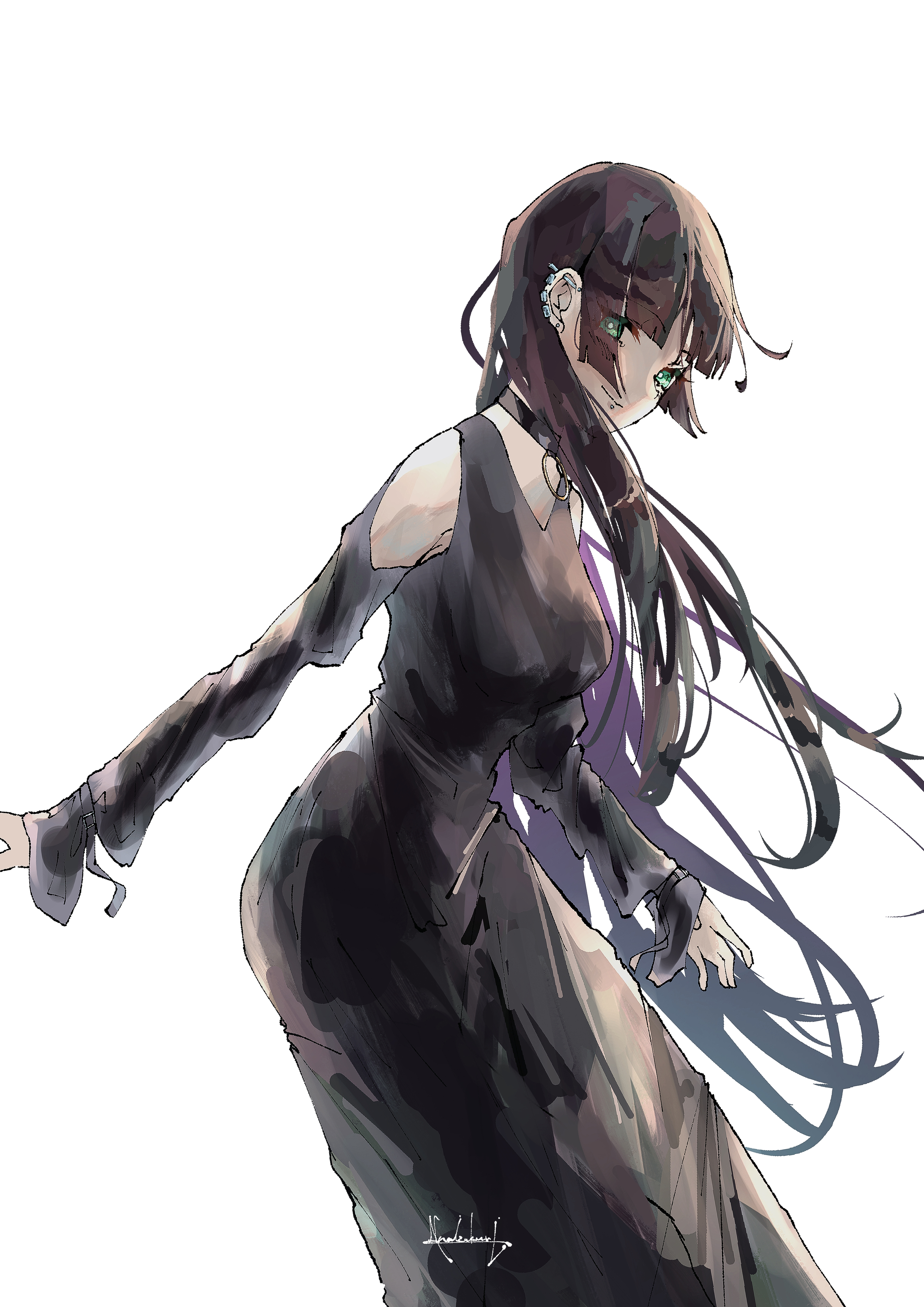 1girl absurdres black_choker black_dress black_hair blunt_bangs bocchi_the_rock! breasts chin_piercing choker closed_mouth clothing_cutout colored_inner_hair dress ear_piercing earrings eyes_visible_through_hair face_piercing from_side goth_fashion green_eyes highres hime_cut jewelry labret_piercing large_breasts long_dress long_hair long_sleeves looking_at_viewer multicolored_hair multiple_earrings namizukuri pa-san piercing purple_hair shoulder_cutout signature simple_background smile solo standing white_background