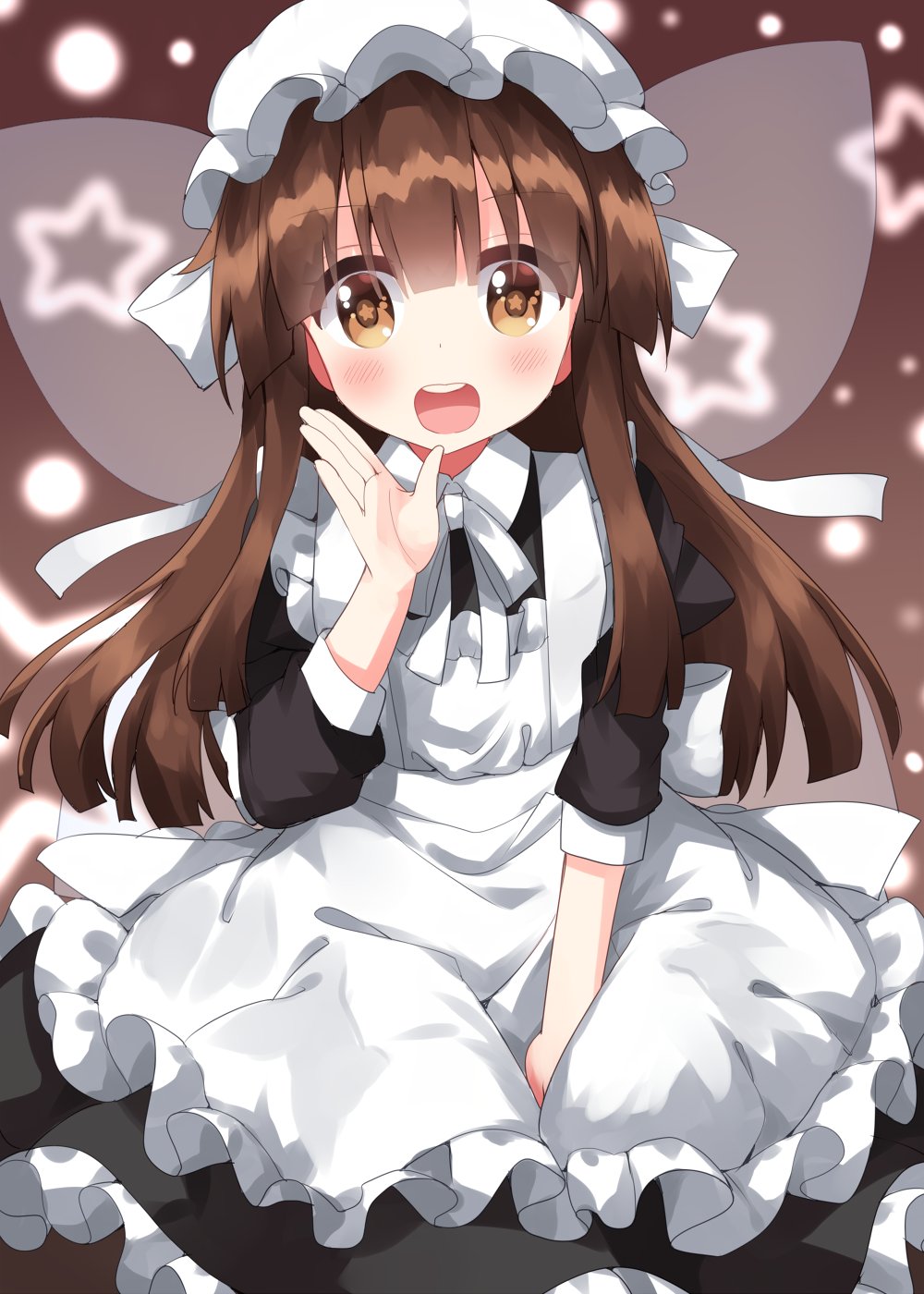 1girl apron brown_eyes brown_hair copyright_request dress fairy fairy_wings frilled_dress frilled_skirt frills highres knot maid maid_apron maid_headdress one-hour_drawing_challenge open_mouth ruu_(tksymkw) skirt star_(symbol) star_sapphire touhou wings