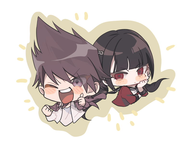 1boy 1girl :d ;d black_hair black_sailor_collar blush brown_background chibi cropped_torso danganronpa_(series) danganronpa_v3:_killing_harmony frown hair_ornament hairclip harukawa_maki jacket liliy1191 long_hair mole mole_under_eye momota_kaito one_eye_closed open_clothes open_jacket open_mouth open_shirt pink_eyes pink_jacket red_eyes red_shirt sailor_collar shirt smile spiked_hair thumbs_up white_background white_shirt