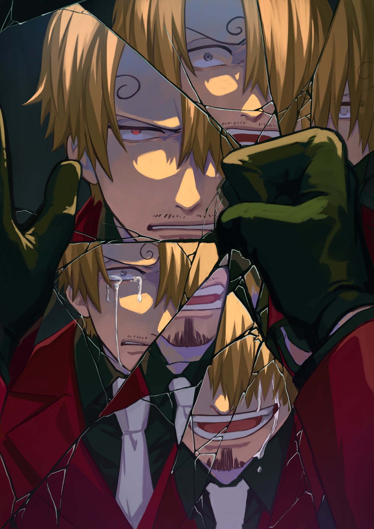 black_gloves blonde_hair blue_eyes broken_mirror clenched_hand crying crying_with_eyes_open curly_eyebrows different_reflection facial_hair formal_clothes gloves hair_over_one_eye highres jennyandloiryan long_sleeves male_focus mirror necktie one_piece red_eyes red_suit reflection sanji_(one_piece) short_hair suit tears