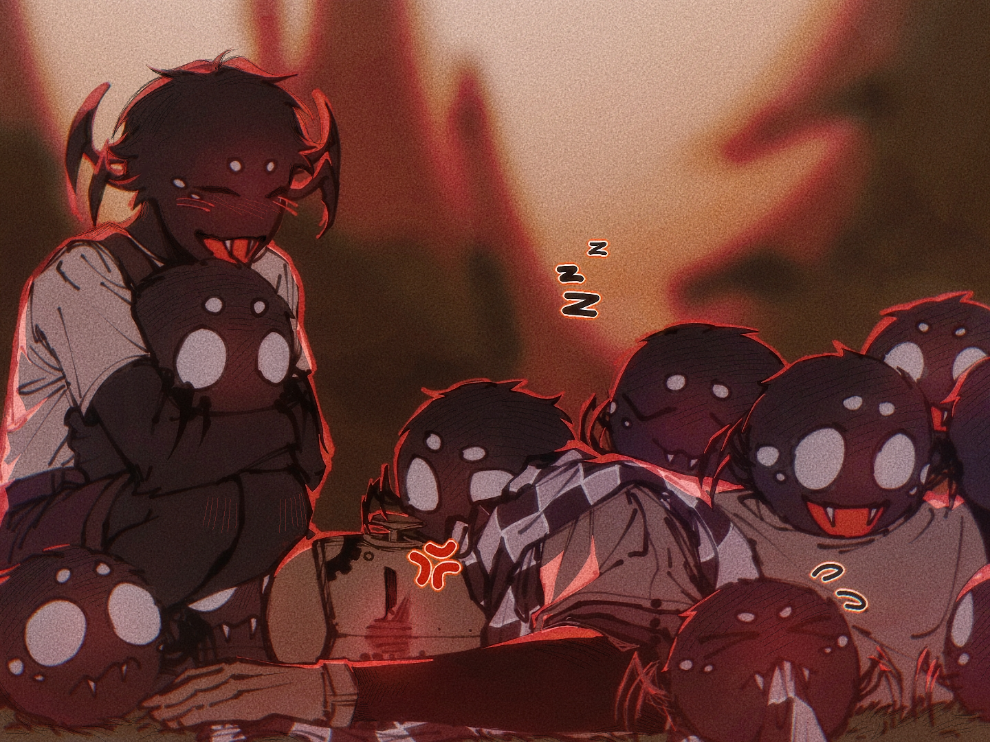 1boy 1other android anger_vein animal animal_hug annoyed arthropod_boy backlighting biting blank_eyes blurry blurry_background bug checkered_clothes closed_eyes closed_mouth don't_starve fangs fangs_out flying_sweatdrops gears grey_shirt happy laughing layered_sleeves long_sleeves lying nature on_ground on_side open_mouth outdoors pine_tree purple_shorts shanyizhe shirt short_over_long_sleeves short_sleeves shorts sleeping spider spider_boy squatting tree twilight uneven_eyes webber_(don't_starve) white_shirt wx-78 zzz
