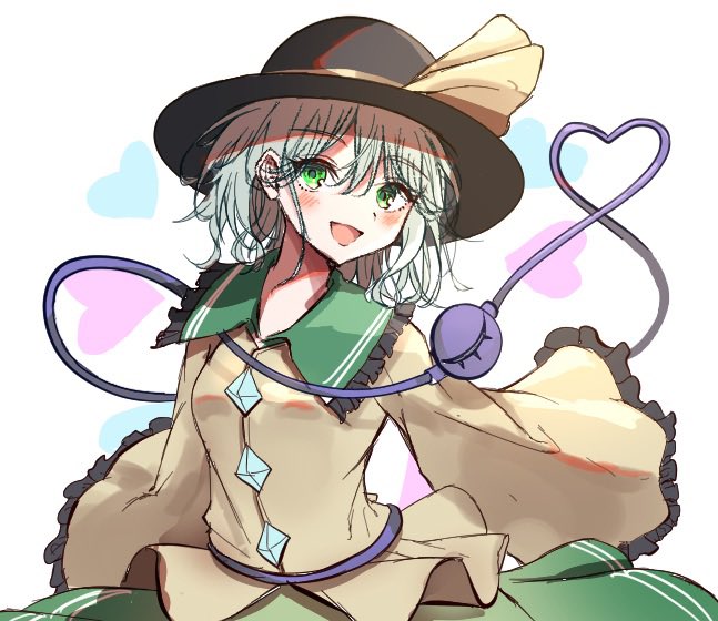 1girl :d black_hat green_eyes green_hair green_skirt hat hat_ribbon heart heart_of_string hegata_(hegatia_lapis) komeiji_koishi long_sleeves looking_at_viewer open_mouth ribbon shirt short_hair skirt smile solo third_eye touhou upper_body yellow_ribbon yellow_shirt
