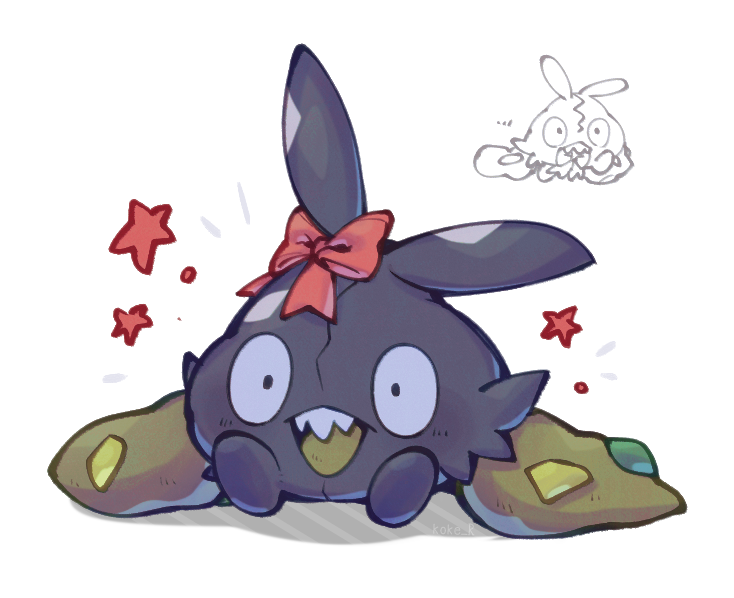 :d alternate_color black_eyes bow commentary_request gen_5_pokemon happy kokemushi_(kuru_fox) nintendo no_humans open_mouth partially_colored pokemon pokemon_(creature) shiny_pokemon sitting smile star_(symbol) teeth tongue trubbish upper_teeth_only white_background