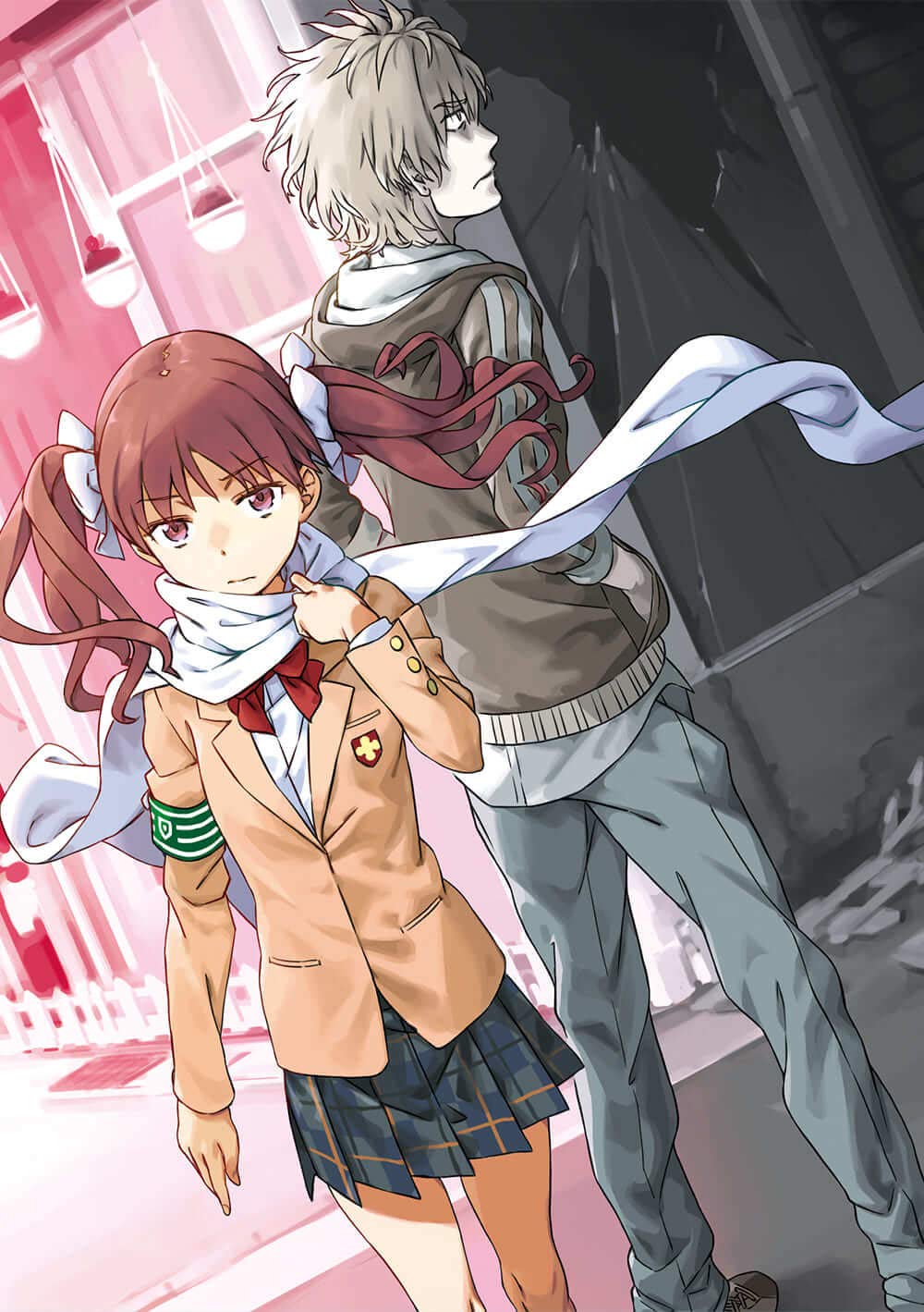 1boy 1girl adjusting_scarf arm_at_side armband back-to-back blazer blue_skirt bow bowtie broken_glass broken_window brown_hair brown_hoodie brown_jacket closed_mouth constricted_pupils cover cover_page drain_(object) dress_shirt dutch_angle expressionless facing_away floating_hair frown furrowed_brow glass green_armband grey_footwear grey_hair grey_pants hair_bow hair_ribbon hamazura_shiage hand_up highres hood hood_down hoodie jacket long_hair long_sleeves looking_ahead looking_at_viewer novel_cover official_art open_clothes open_jacket pants plaid_clothes plaid_skirt pleated_skirt red_bow red_bowtie ribbon road scarf school_uniform shirai_kuroko shirt shoes skirt sneakers standing street textless_version third-party_source toaru_majutsu_no_index toaru_majutsu_no_index:_genesis_testament tokiwadai_school_uniform twintails upturned_eyes wavy_hair white_bow white_ribbon white_scarf white_shirt window