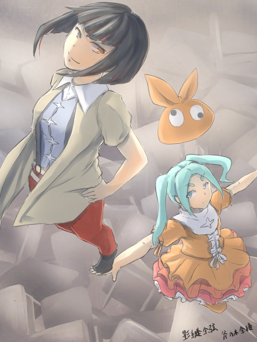 2girls aqua_eyes bakemonogatari balancing black_footwear black_hair blue_shirt blunt_bangs bob_cut breasts brown_background brown_eyes brown_shirt carrying carrying_person character_name closed_mouth commentary desk dress floating_clothes floating_hair frilled_dress frills from_above full_body googly_eyes gradient_clothes gradient_dress hands_on_own_hips hat highres hikimayu kagenui_yozuru light_smile long_hair looking_at_another looking_down looking_up medium_breasts midriff midriff_peek monogatari_(series) multicolored_hair multiple_girls nisemonogatari ononoki_yotsugi open_clothes open_shirt orange_dress orange_headwear outstretched_arms pants parted_bangs perspective pile red_dress red_hair red_pants school_desk shirt short_eyebrows short_hair short_sleeves sidelocks standing standing_on_person streaked_hair suspenders t-pose thick_eyebrows thomas_(aoakumasan) translated twintails unworn_headwear white_dress white_shirt