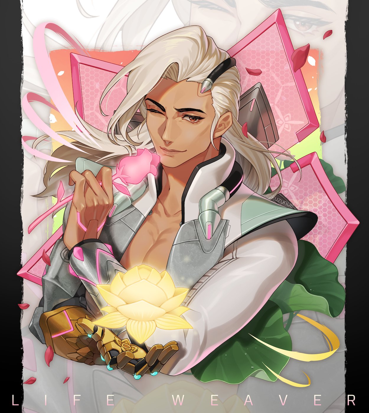 1boy armor brown_eyes character_name collarbone commentary dark_skin flower gold_armor highres holding holding_flower kuzunue lifeweaver_(overwatch) long_hair looking_at_viewer male_focus one_eye_closed open_clothes overwatch overwatch_2 pectorals petals pink_flower rose solo upper_body white_flower white_hair white_sleeves