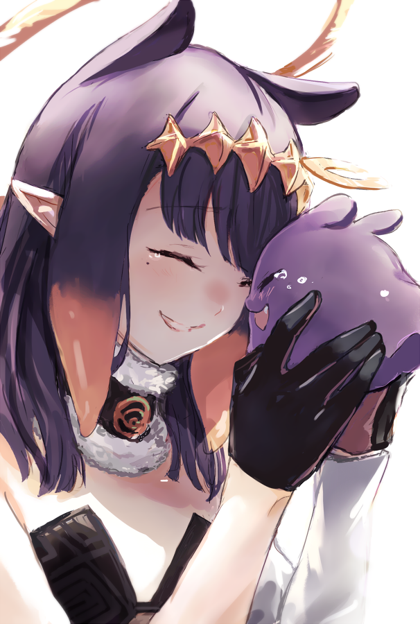 1girl 1other black_gloves blunt_bangs closed_eyes commentary dress english_commentary fur-trimmed_collar fur_trim gloves gradient_hair halo happy_tears headpiece hololive hololive_english long_hair mole mole_under_eye multicolored_hair ninomae_ina'nis ninomae_ina'nis_(1st_costume) octopus orange_hair pointy_ears purple_hair sidelocks simple_background smile strapless strapless_dress takodachi_(ninomae_ina'nis) tears tentacle_hair tube_dress virtual_youtuber white_background yuuyu_(777)
