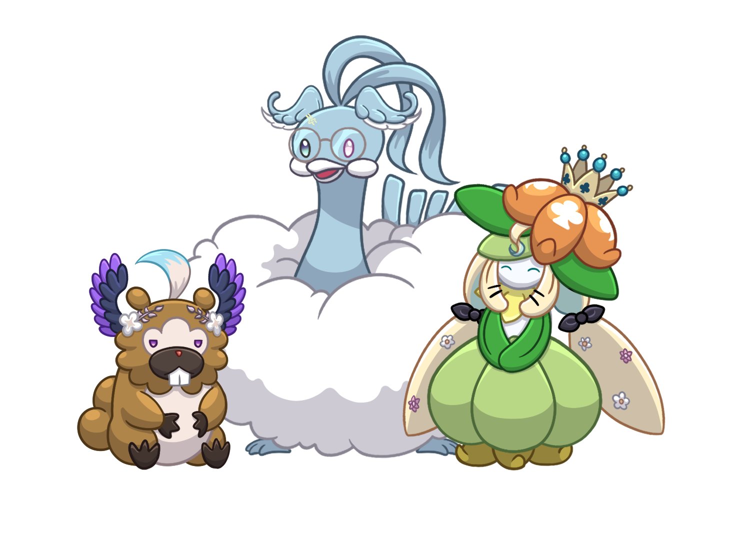 3girls ahoge altaria animalization bidoof blue_eyes closed_eyes commentary elira_pendora english_commentary enna_alouette gen_3_pokemon gen_4_pokemon gen_5_pokemon glasses head_wings heterochromia kammuy lilligant millie_parfait multiple_girls nijisanji nijisanji_en nintendo pokemon pokemon_(creature) purple_eyes round_eyewear simple_background virtual_youtuber white_background wings