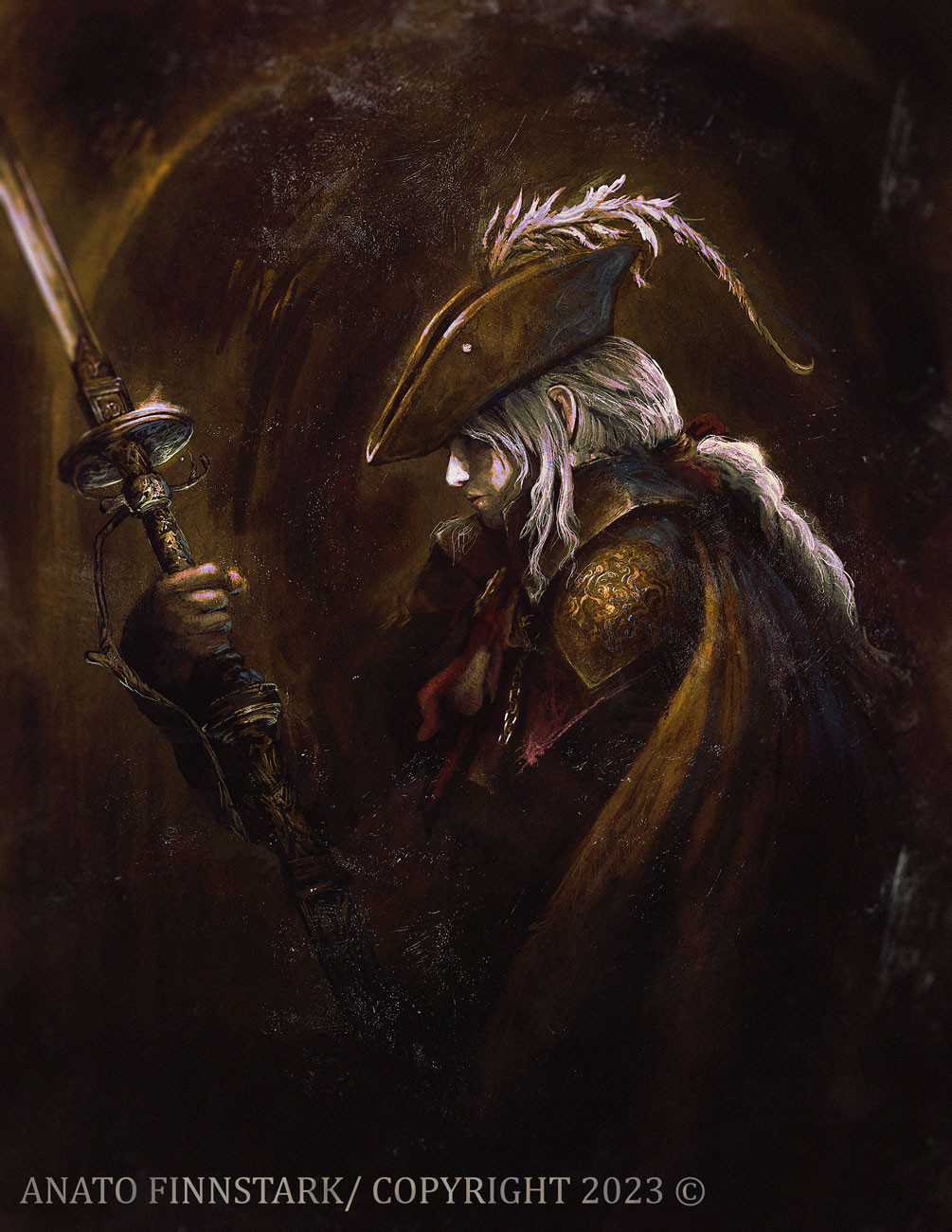 1girl anato_finnstark ascot bloodborne cape coat commentary dark english_commentary fantasy gem gloves goth_fashion hat hat_feather highres holding holding_sword holding_weapon jewelry lady_maria_of_the_astral_clocktower long_hair ponytail portrait rakuyo_(bloodborne) solo sword tricorne twin_blades weapon white_hair