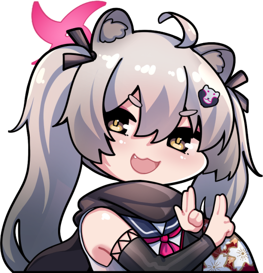 1girl animal_ears blue_archive chibi fang grey_hair halo michiru_(blue_archive) ninja school_uniform skin_fang solo sugoidere twintails