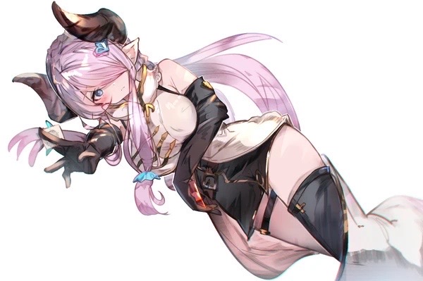 1girl blue_eyes breasts granblue_fantasy horns large_breasts looking_at_viewer narmaya_(granblue_fantasy) pink_hair reaching reaching_towards_viewer tota_(sizukurubiks) white_background