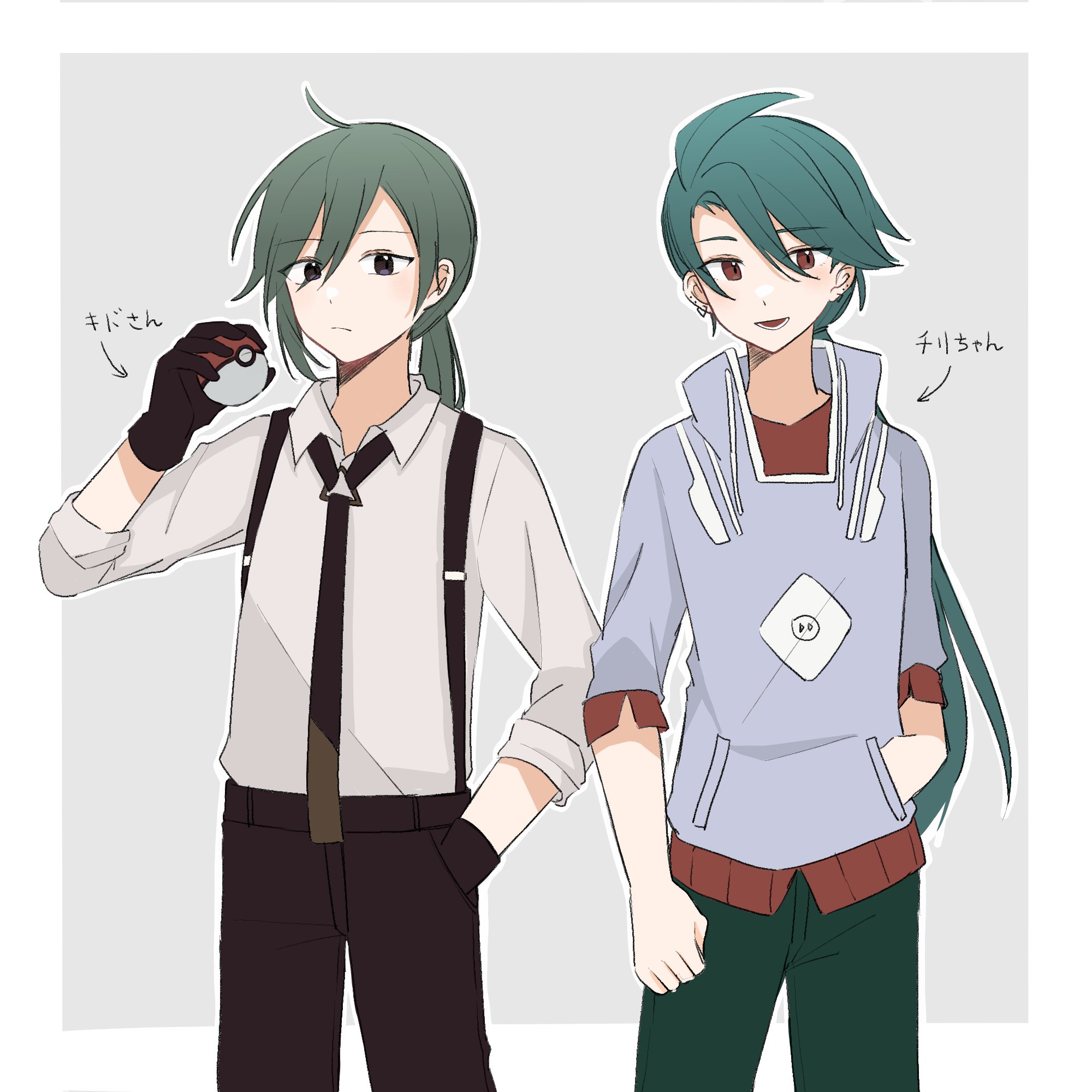 2girls androgynous arrow_(symbol) asymmetrical_bangs asymmetrical_hair black_gloves black_necktie black_pants border character_name closed_mouth collared_shirt color_connection commentary cosplay costume_switch ear_piercing fast_forward_button gloves green_hair green_pants grey_background grey_hoodie hair_between_eyes hair_color_connection hand_in_pocket highres holding holding_poke_ball hood hoodie kagerou_project kido_tsubomi kido_tsubomi_(cosplay) knees_out_of_frame koyon light_frown long_bangs long_hair looking_at_viewer mekakucity_actors multicolored_hoodie multiple_girls necktie nintendo open_collar open_mouth outline outside_border pants piercing poke_ball poke_ball_(basic) pokemon pokemon_scarlet_and_violet ponytail print_hoodie purple_eyes red_eyes red_shirt rika_(pokemon) rika_(pokemon)_(cosplay) shirt simple_background sleeves_rolled_up suspenders three-quarter_sleeves translated tsurime undershirt white_border white_outline