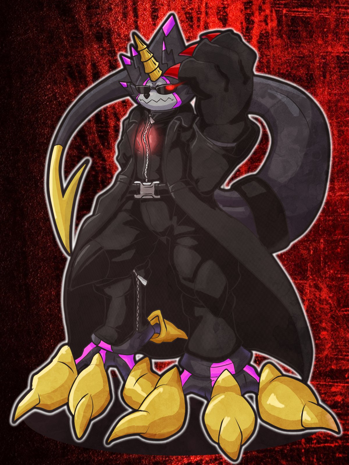 albert_wesker albert_wesker_(cosplay) belt cosplay digimon dinosaur glowing glowing_eye gulusgammamon highres resident_evil sunglasses tail
